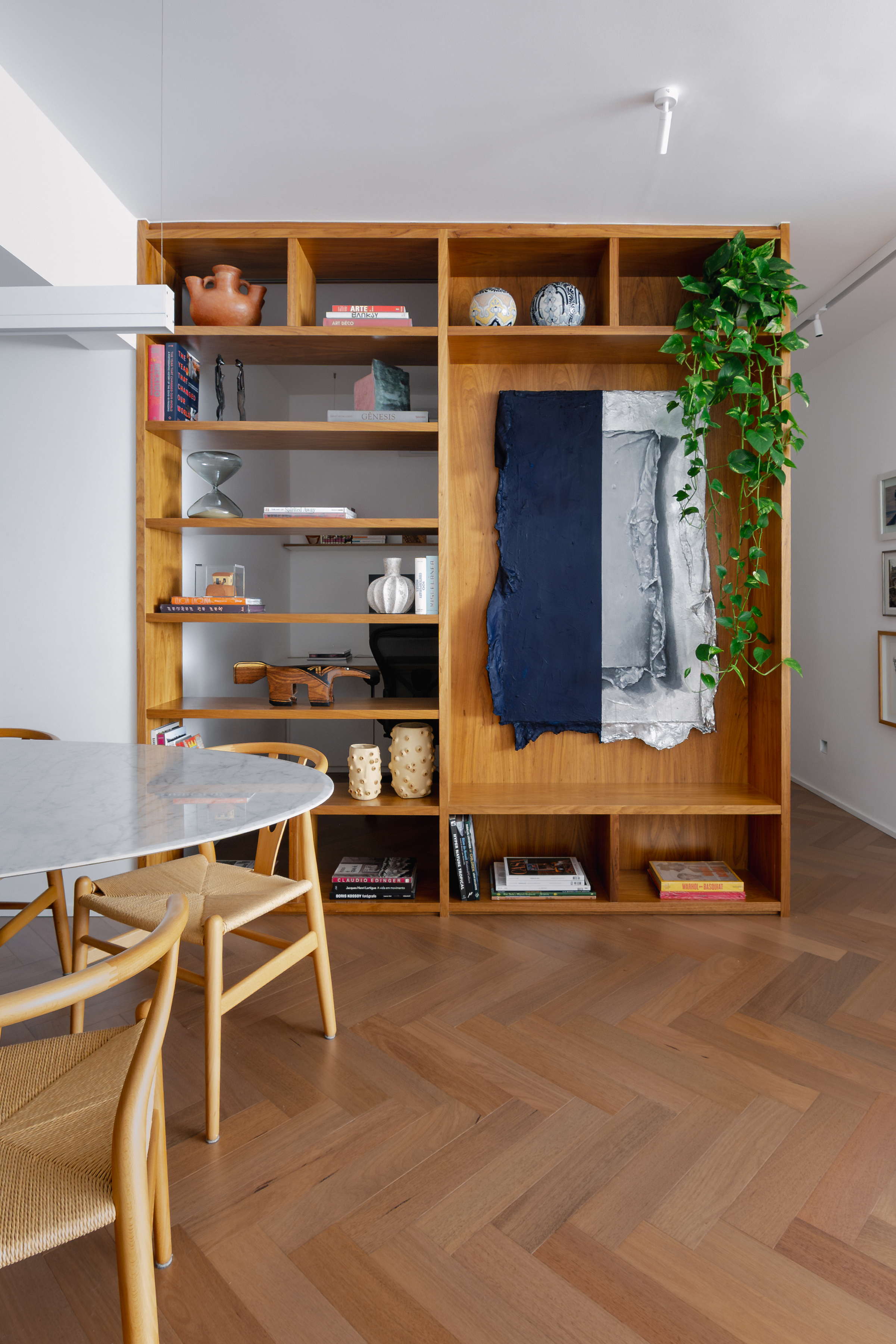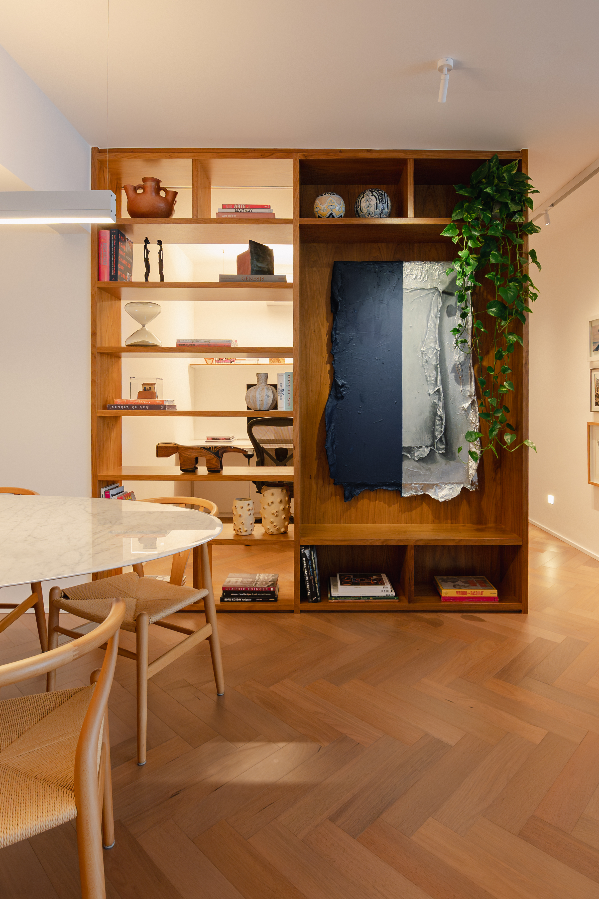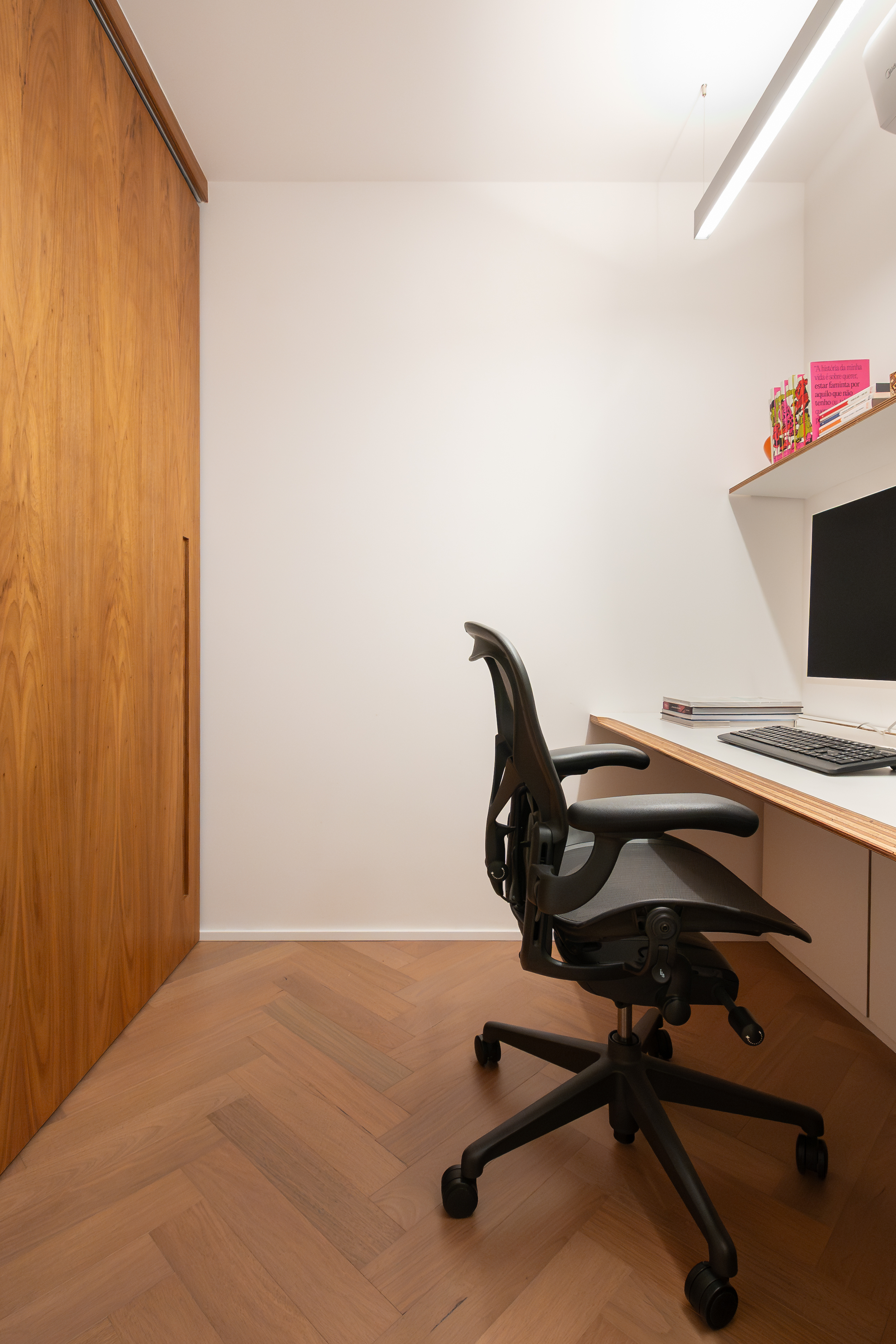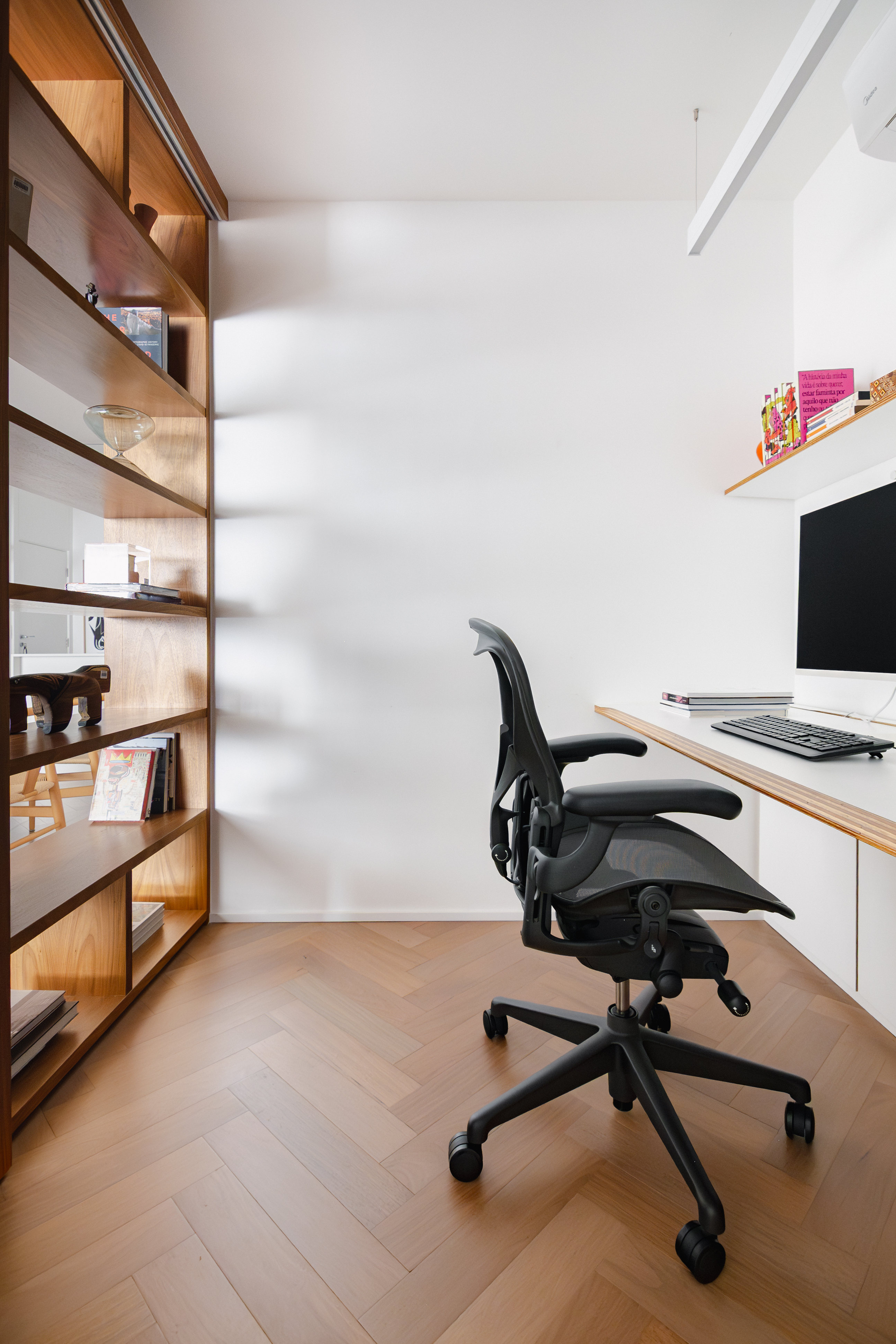A reforma desse apartamento foi pensada para atender uma família em que o casal trabalha majoritariamente em casa. Criamos então 3 possibilidades de ambientes para trabalhar. Um espaço exclusivamente para escritório na sala, um no quarto de hóspedes e um no quarto do casal. Como o espaço disponível para escritório na sala, fica no centro da planta da casa e portanto não tem janela, criamos uma estante que abre metade para sala para entrar luz e ventilação natural. Essa estante também teve a função de destacar uma obra de arte, livros e objetos de decoração, logo na entrada da casa.