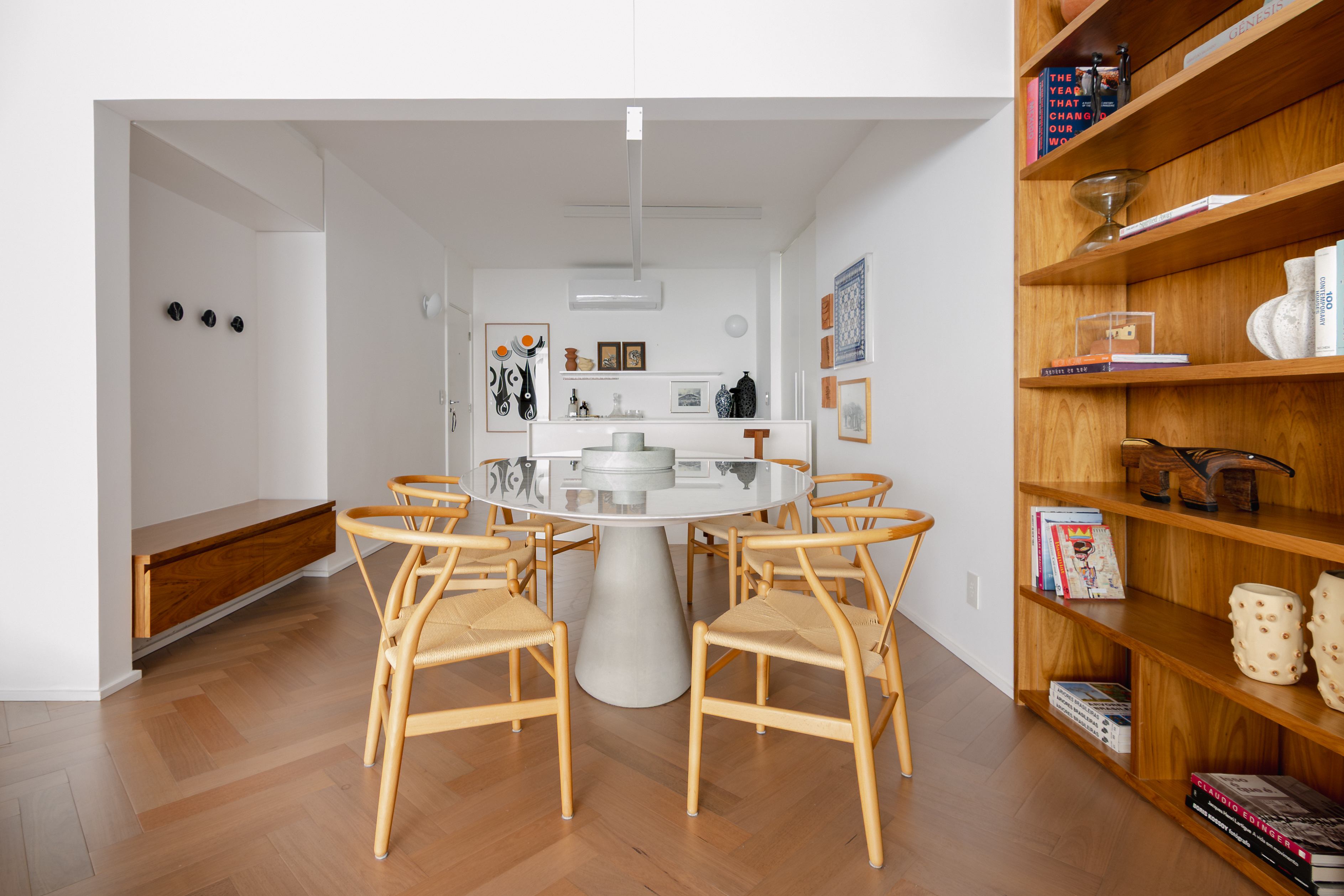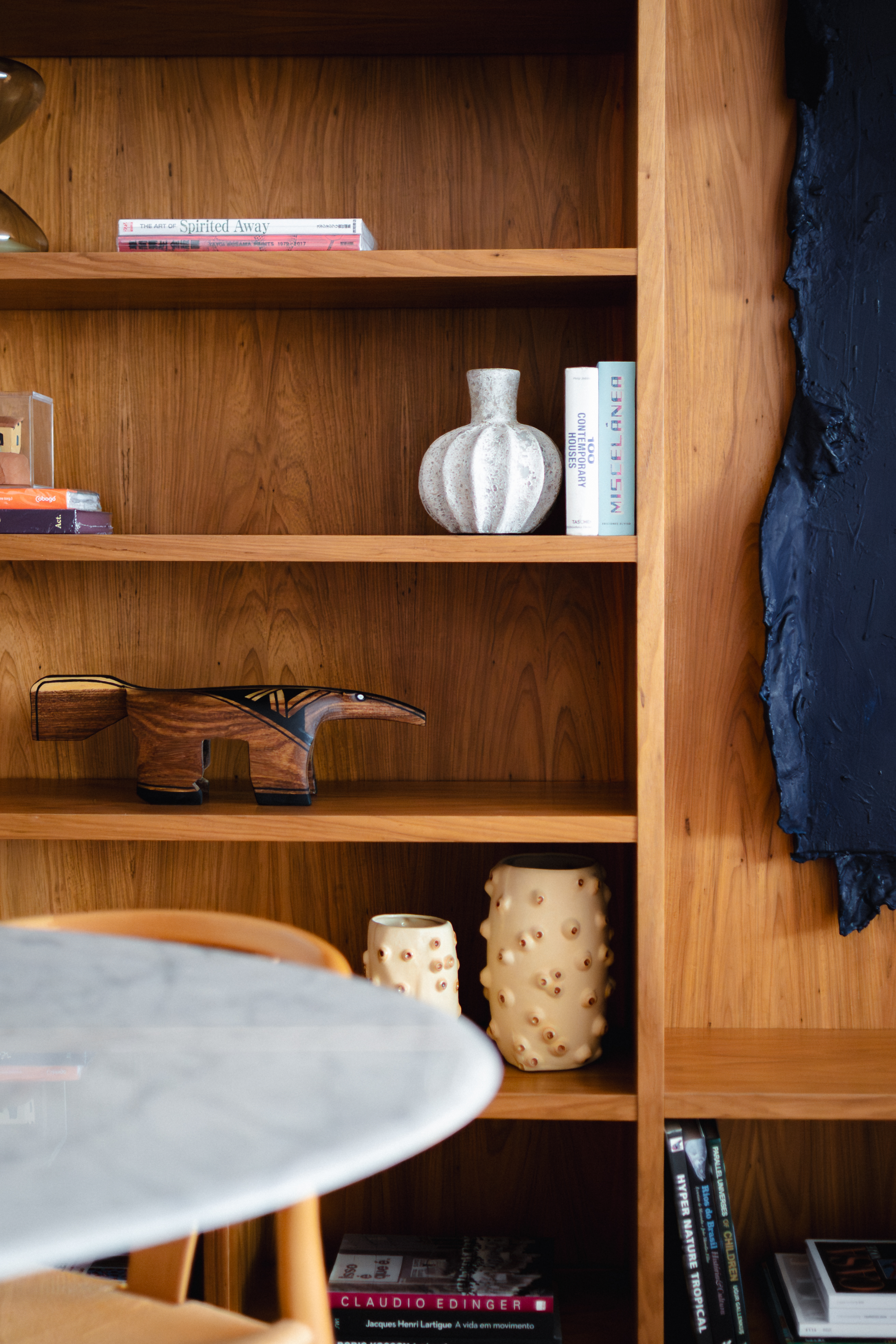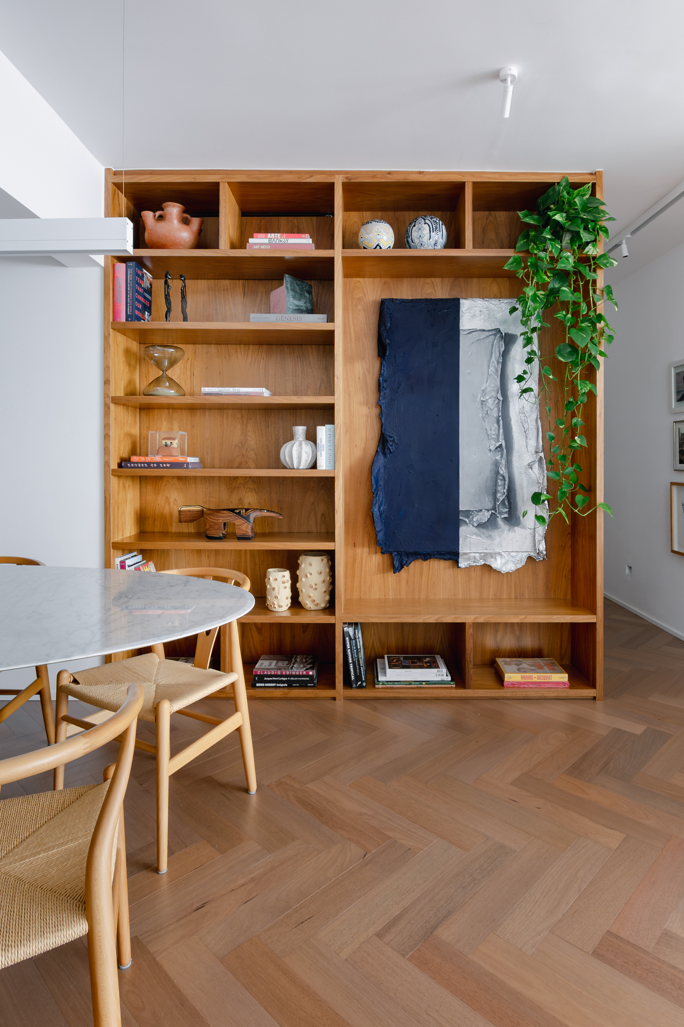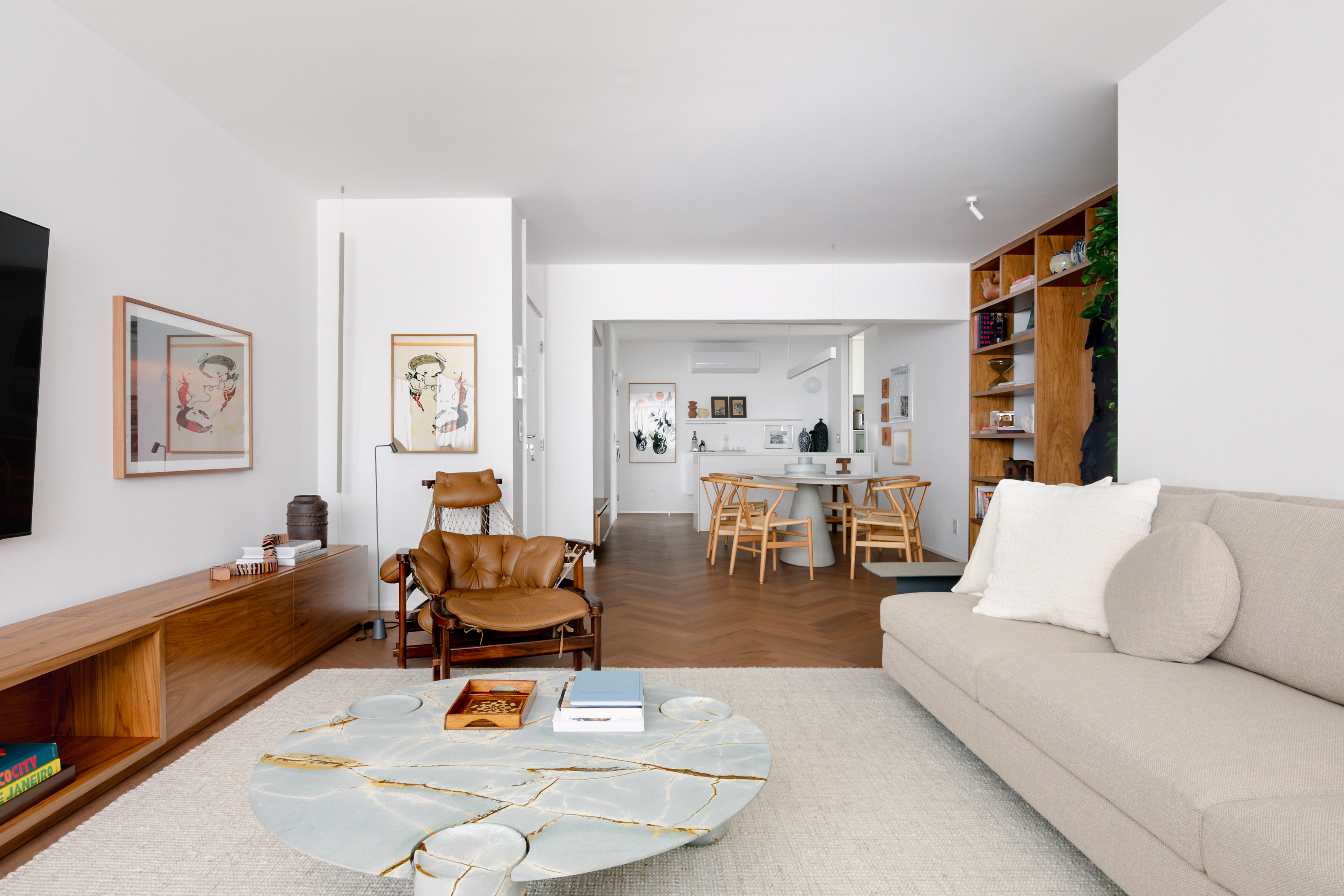 A reforma desse apartamento foi pensada para atender uma família em que o casal trabalha majoritariamente em casa. Criamos então 3 possibilidades de ambientes para trabalhar. Um espaço exclusivamente para escritório na sala, um no quarto de hóspedes e um no quarto do casal. Como o espaço disponível para escritório na sala, fica no centro da planta da casa e portanto não tem janela, criamos uma estante que abre metade para sala para entrar luz e ventilação natural. Essa estante também teve a função de destacar uma obra de arte, livros e objetos de decoração, logo na entrada da casa.