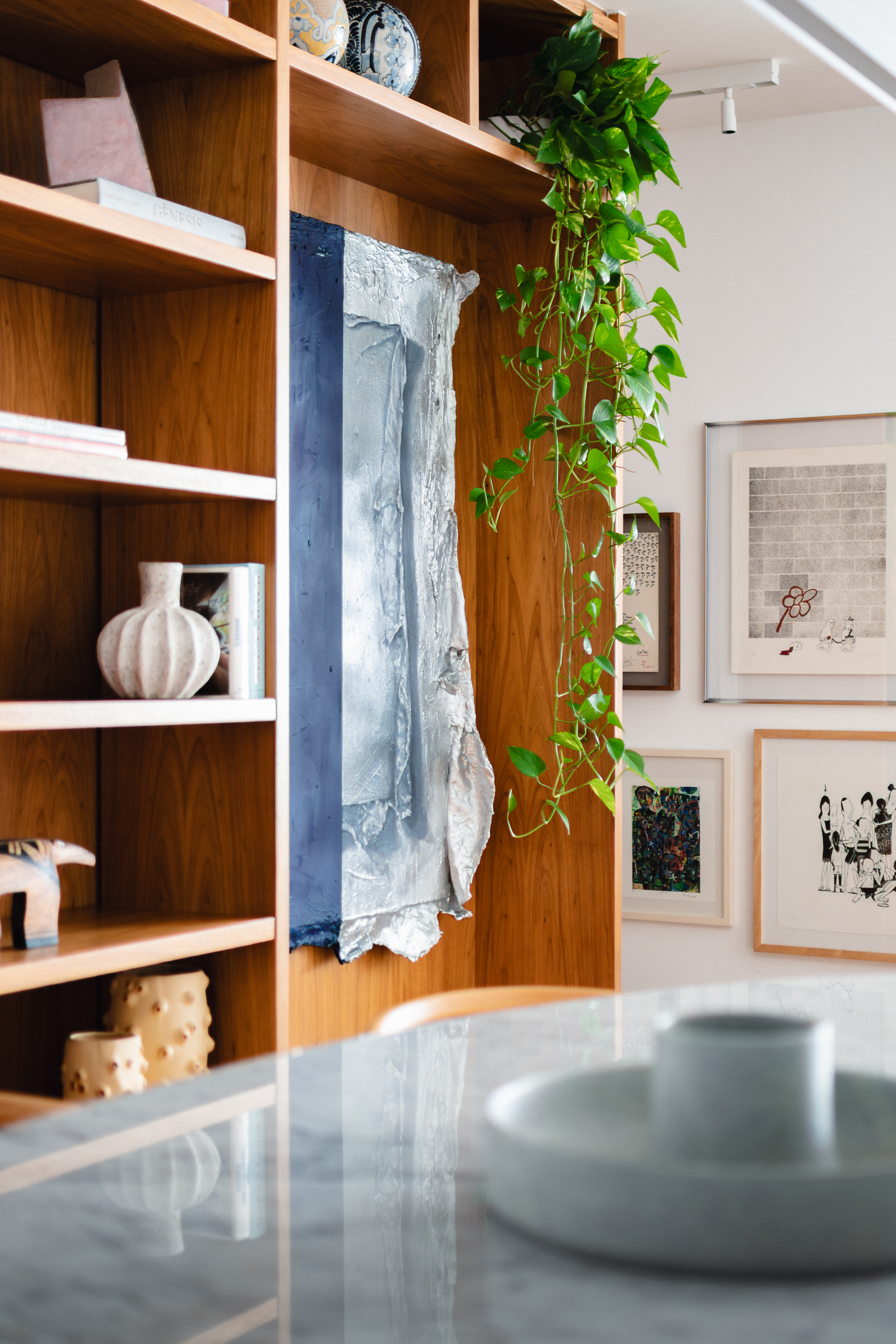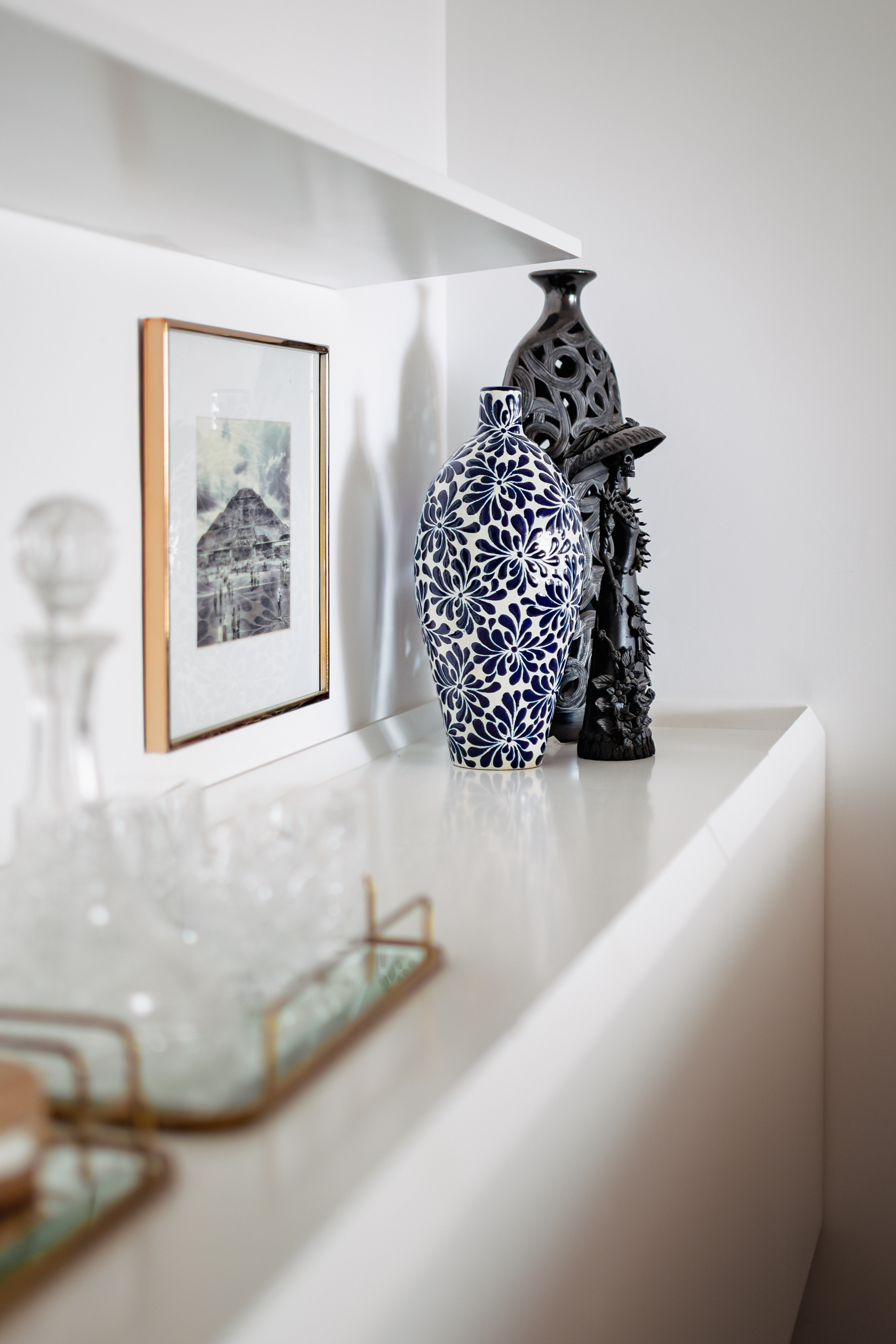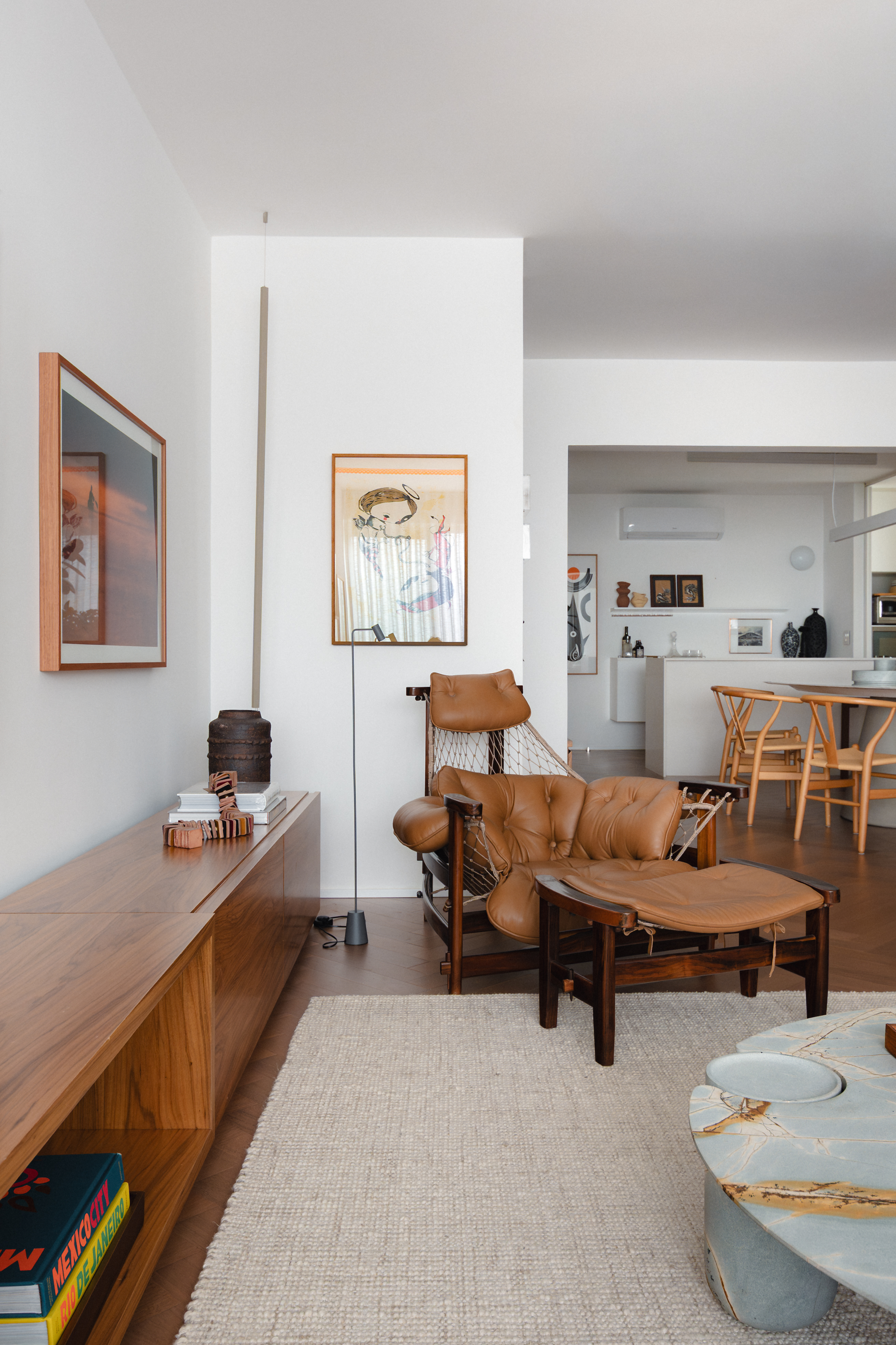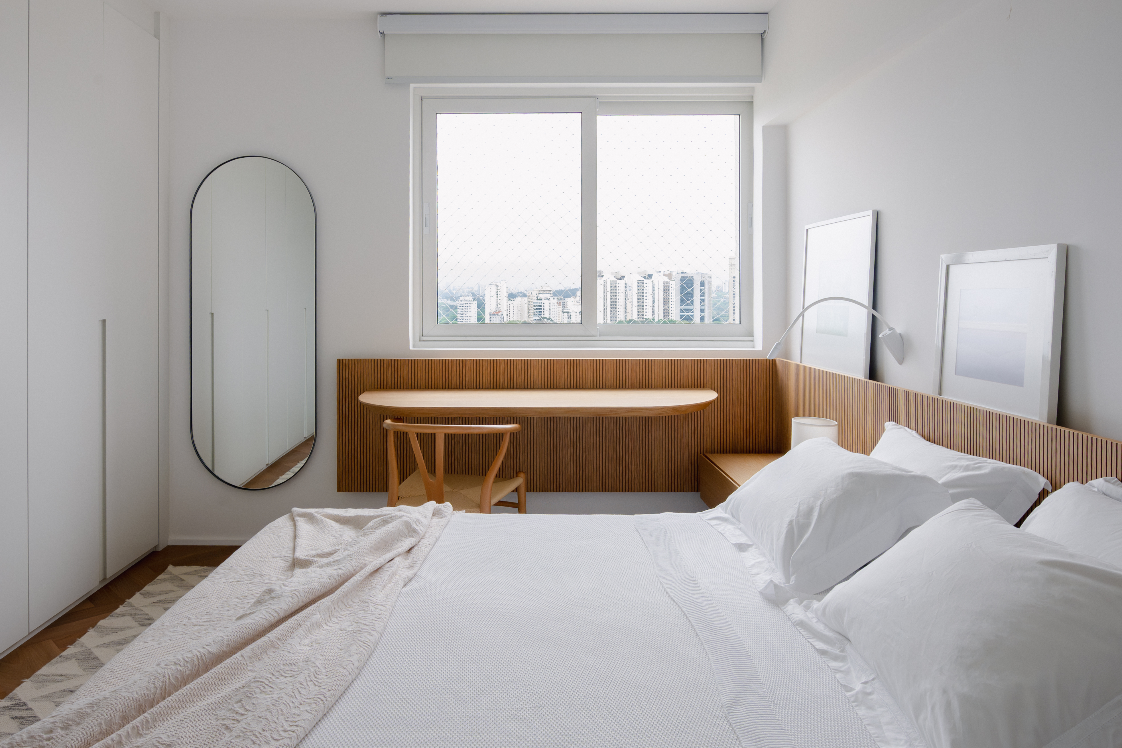 A reforma desse apartamento foi pensada para atender uma família em que o casal trabalha majoritariamente em casa. Criamos então 3 possibilidades de ambientes para trabalhar. Um espaço exclusivamente para escritório na sala, um no quarto de hóspedes e um no quarto do casal. Como o espaço disponível para escritório na sala, fica no centro da planta da casa e portanto não tem janela, criamos uma estante que abre metade para sala para entrar luz e ventilação natural. Essa estante também teve a função de destacar uma obra de arte, livros e objetos de decoração, logo na entrada da casa.