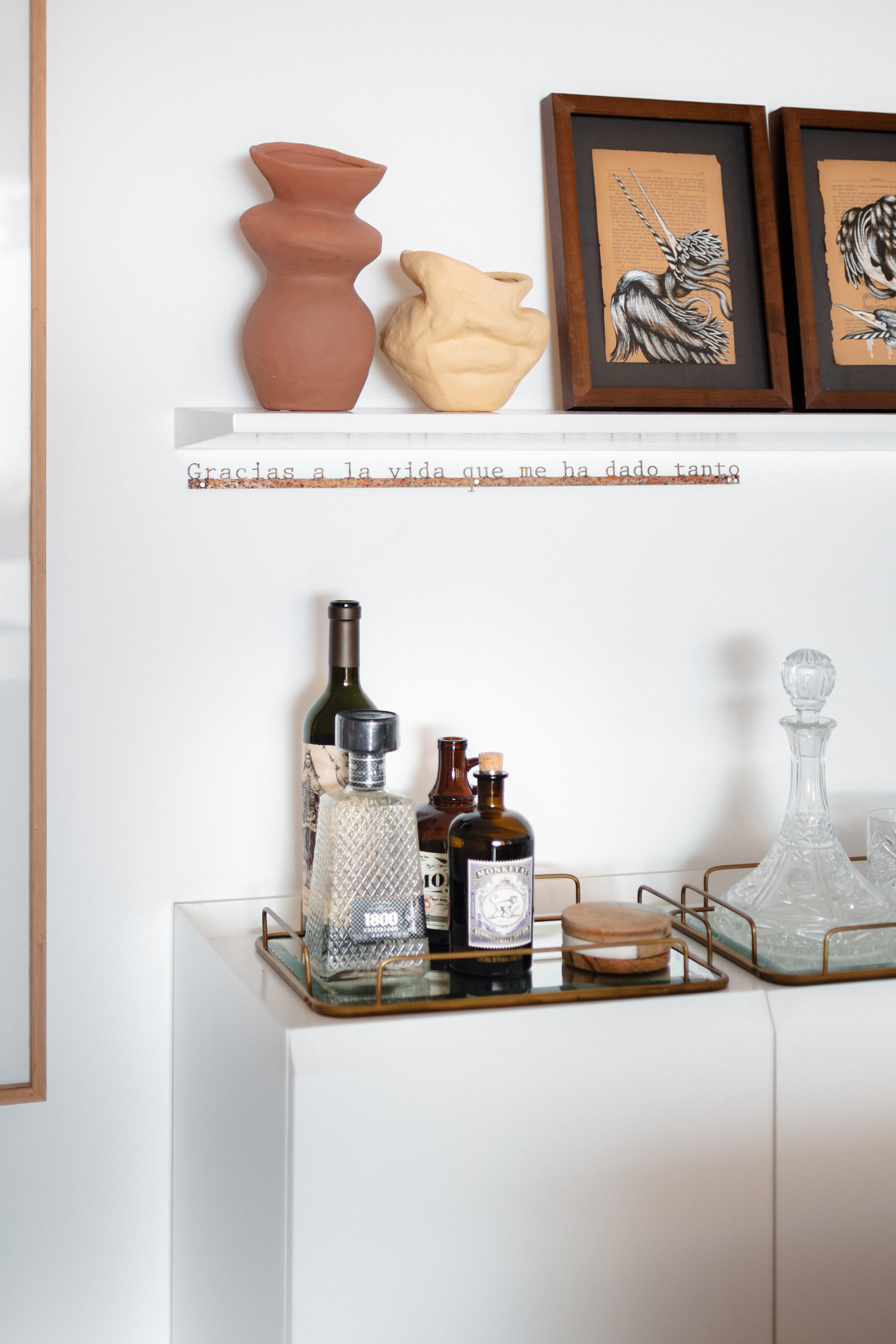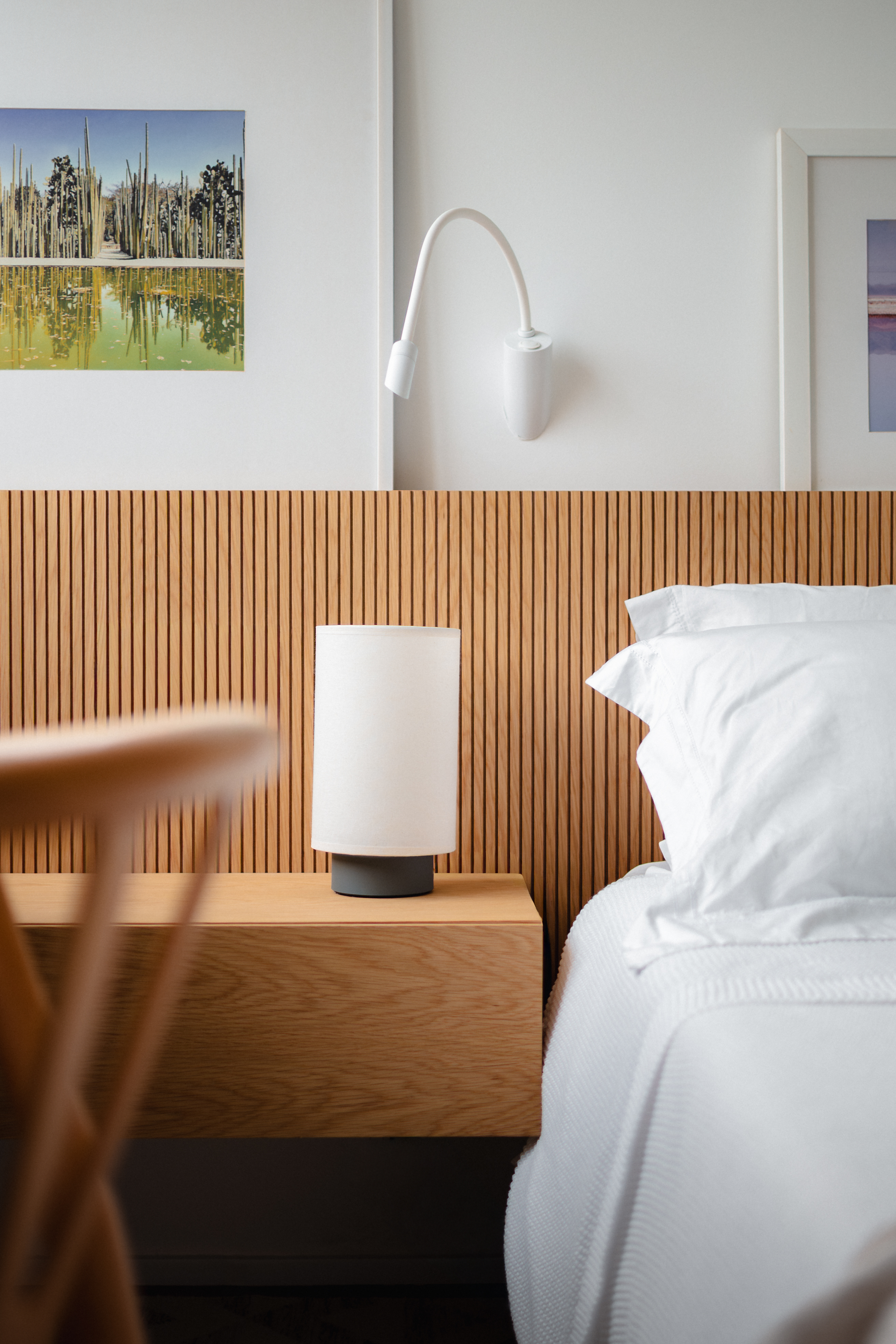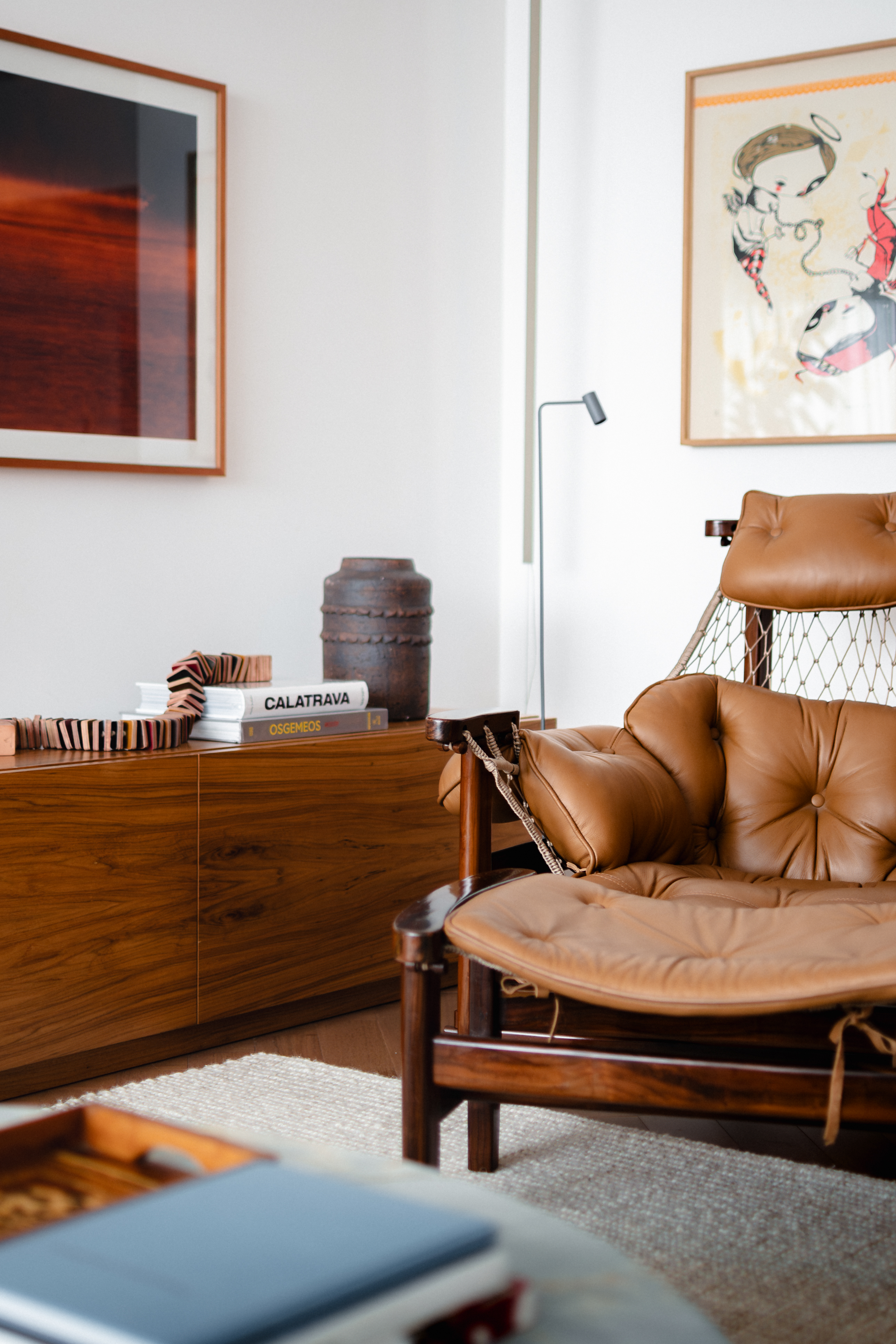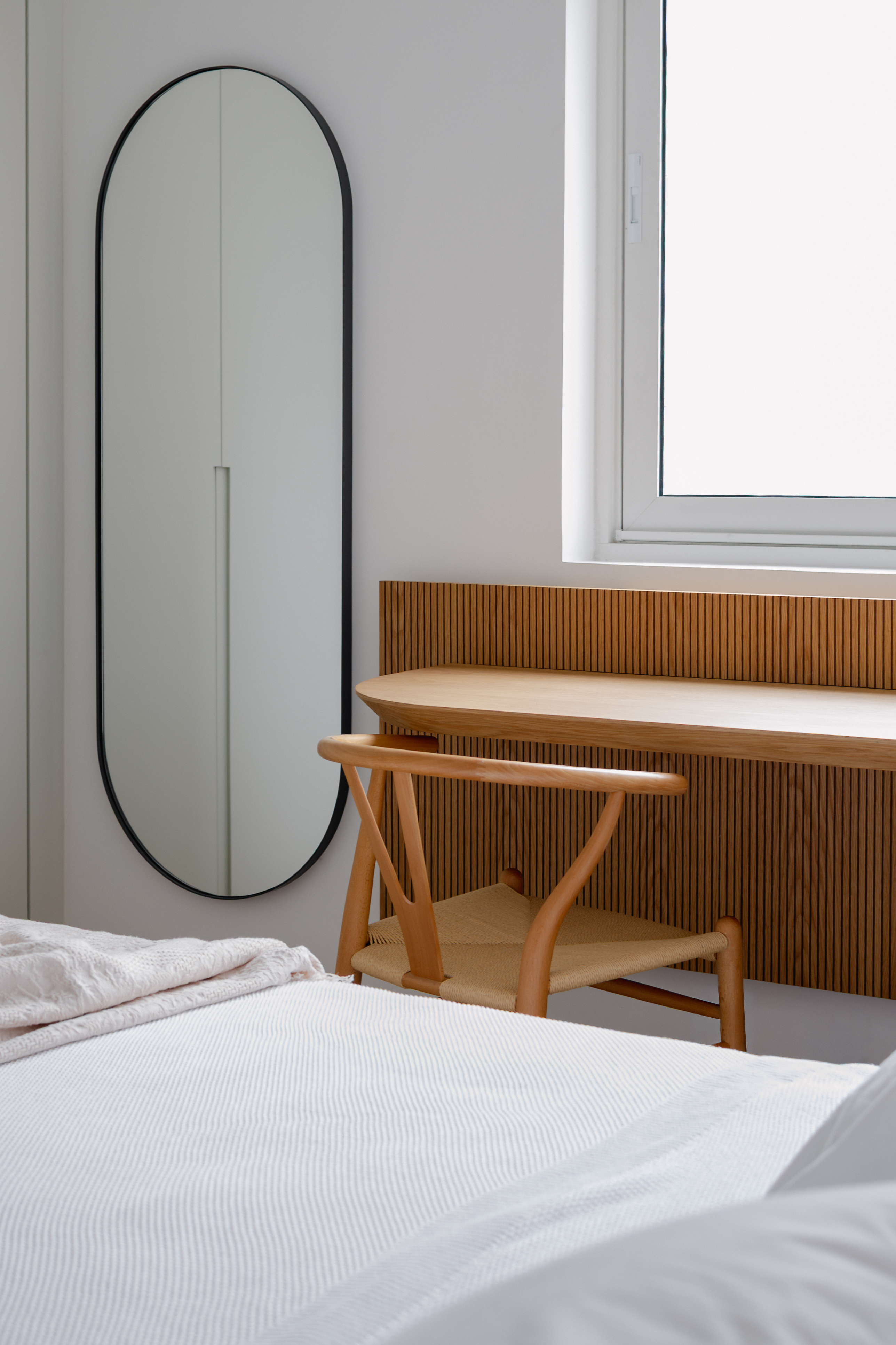 A reforma desse apartamento foi pensada para atender uma família em que o casal trabalha majoritariamente em casa. Criamos então 3 possibilidades de ambientes para trabalhar. Um espaço exclusivamente para escritório na sala, um no quarto de hóspedes e um no quarto do casal. Como o espaço disponível para escritório na sala, fica no centro da planta da casa e portanto não tem janela, criamos uma estante que abre metade para sala para entrar luz e ventilação natural. Essa estante também teve a função de destacar uma obra de arte, livros e objetos de decoração, logo na entrada da casa.