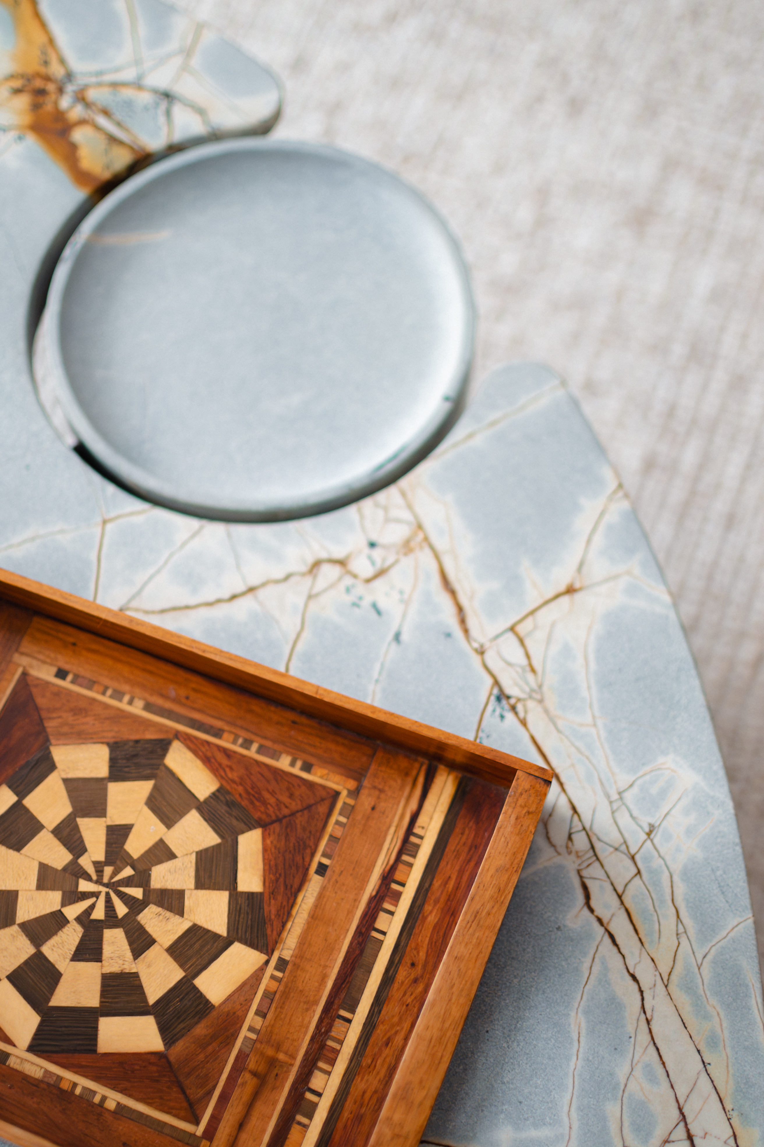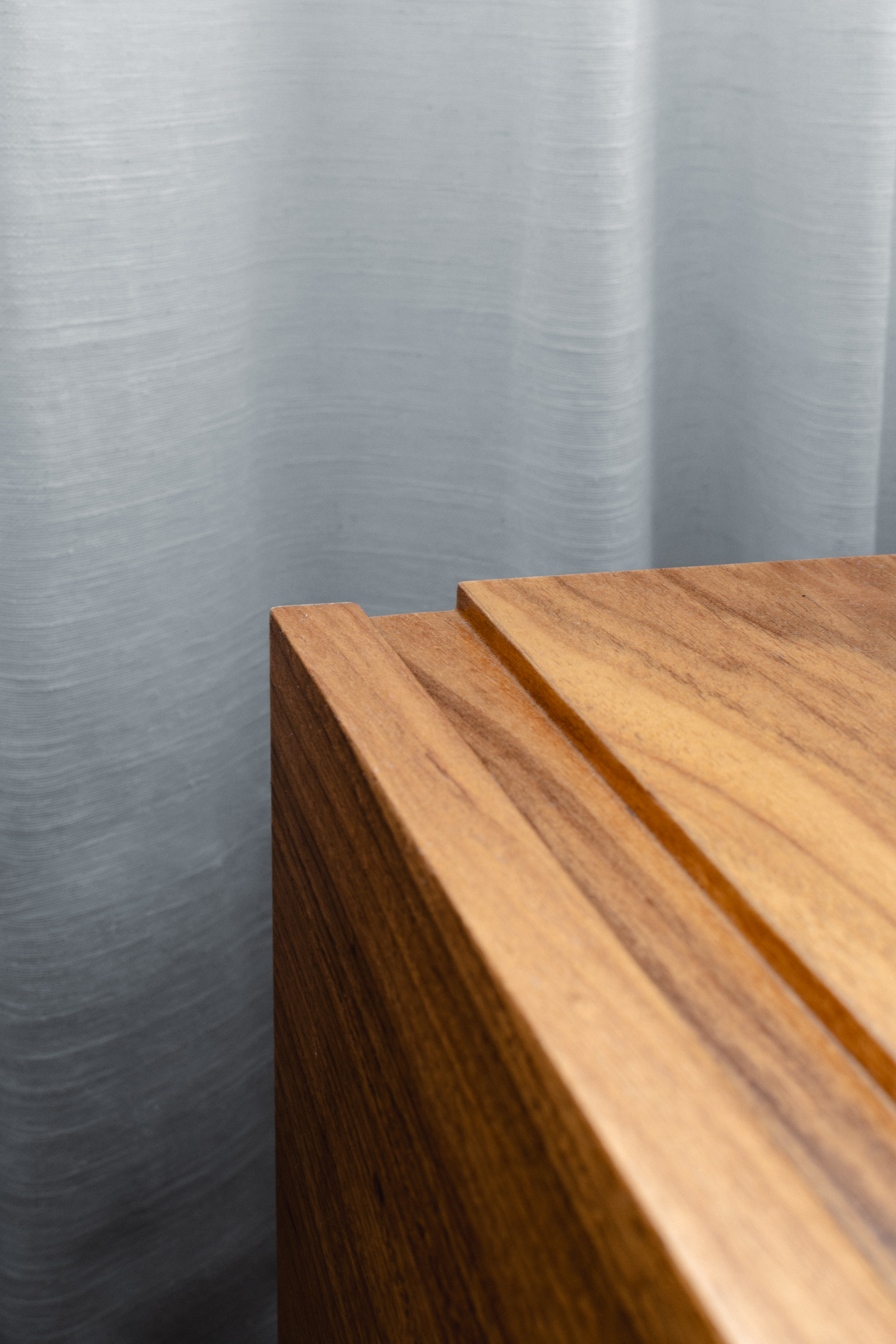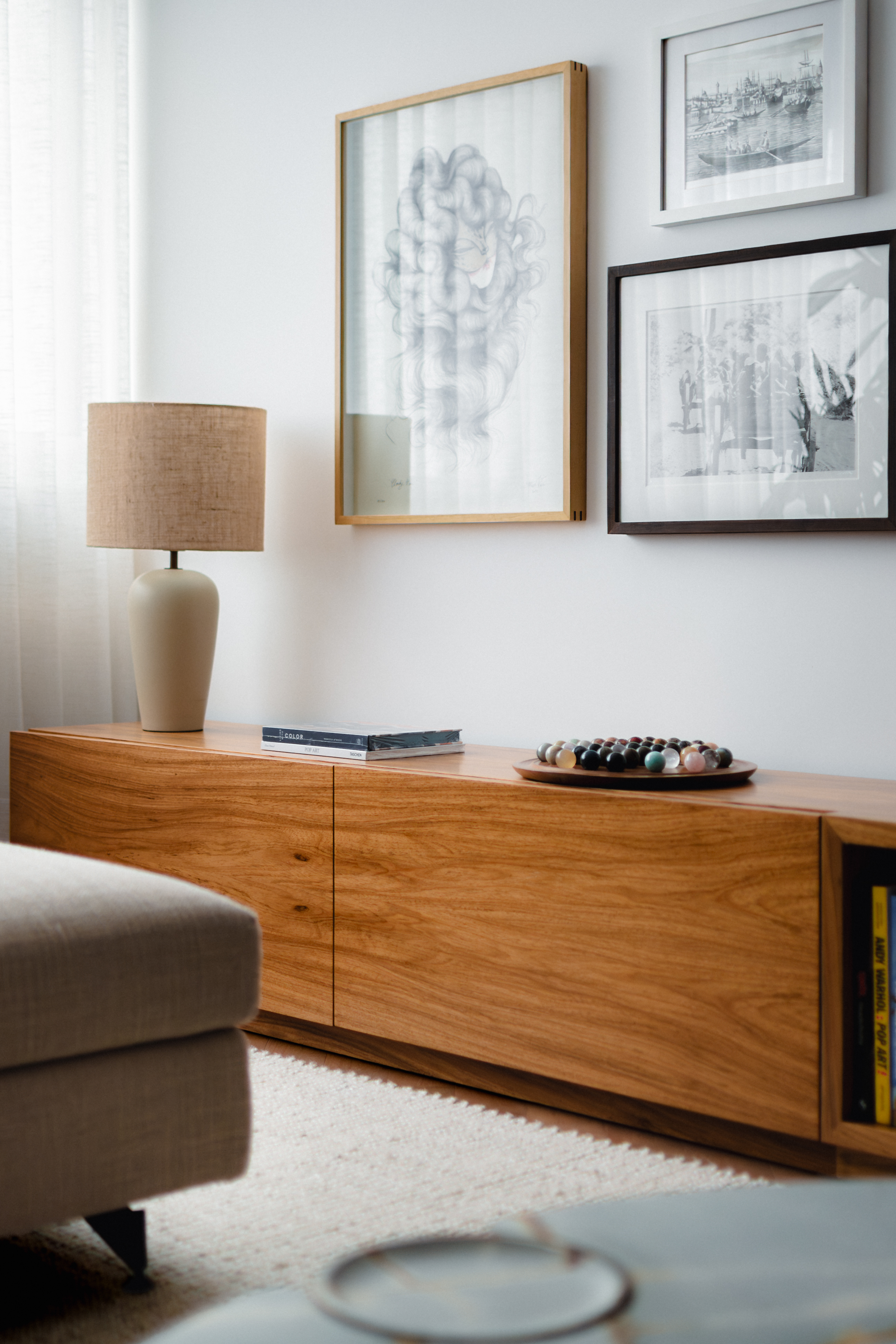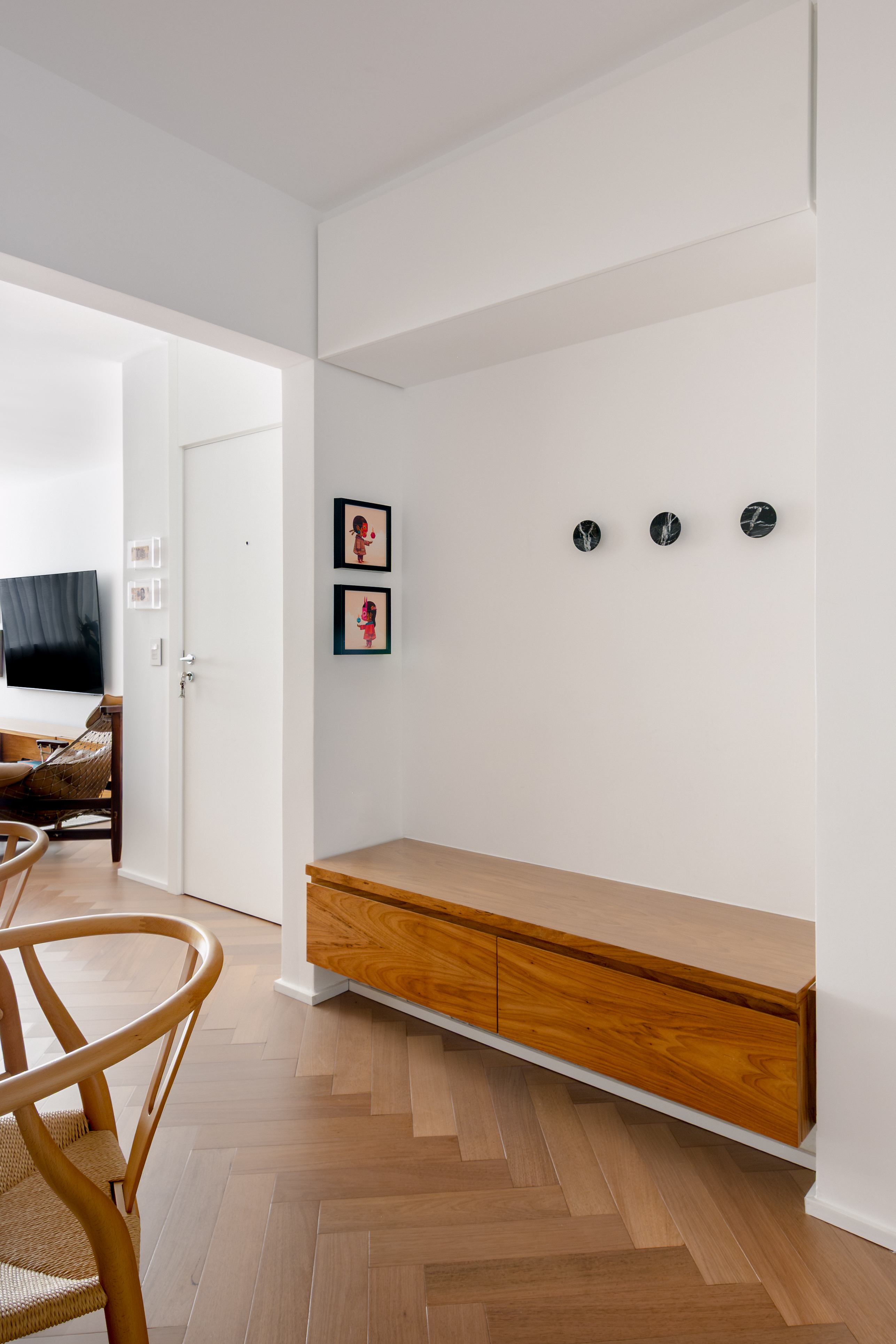 Na sala de estar, fizemos um grande aparador quase da largura da sala que serve de rack para tv, apoio para a poltrona de leitura e até banco. Próximo a porta de entrada social, aproveitamos o nicho existente para fazer um banco com gavetas, para os moradores poderem tirar e guardar os sapatos.