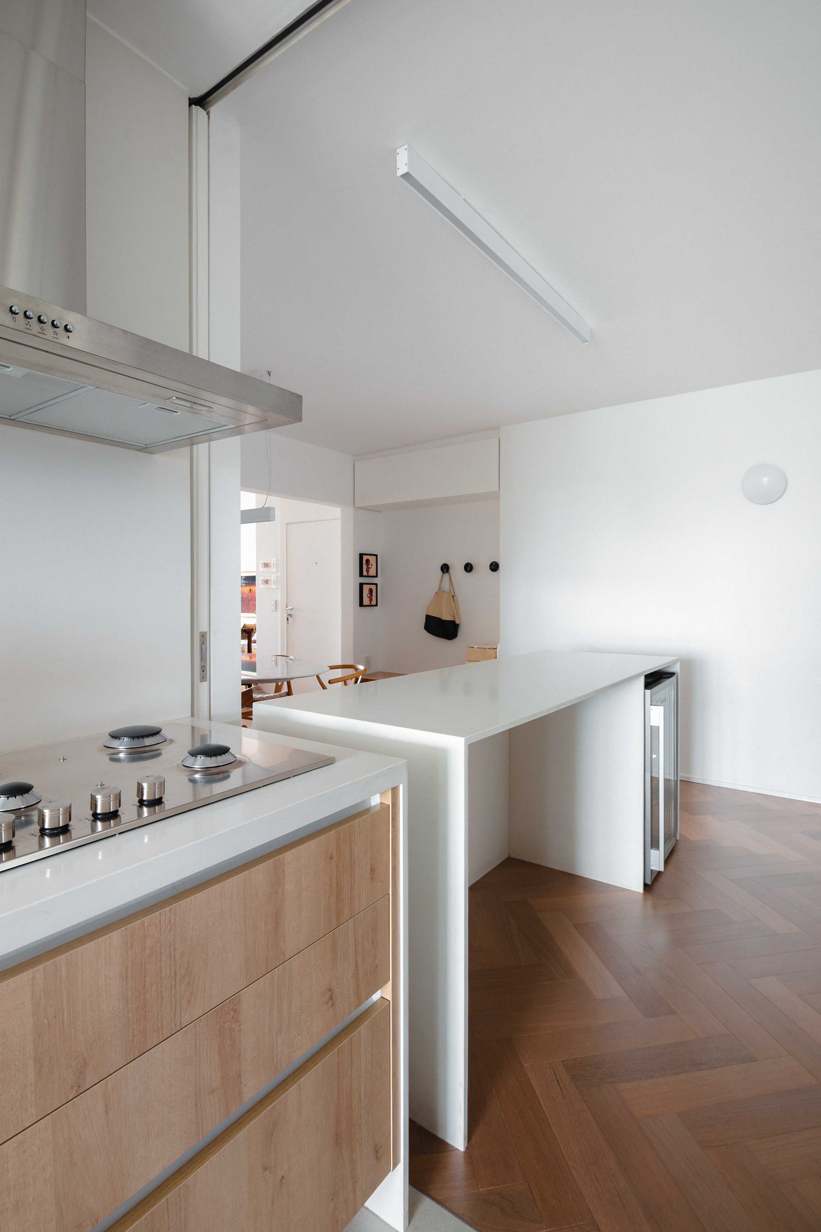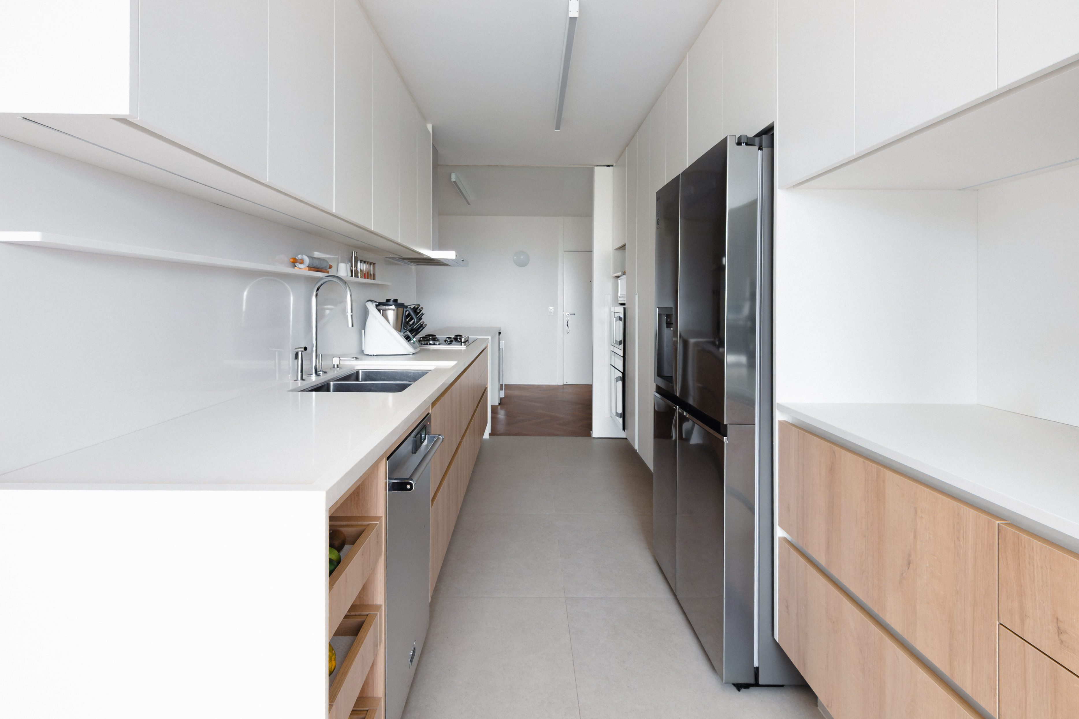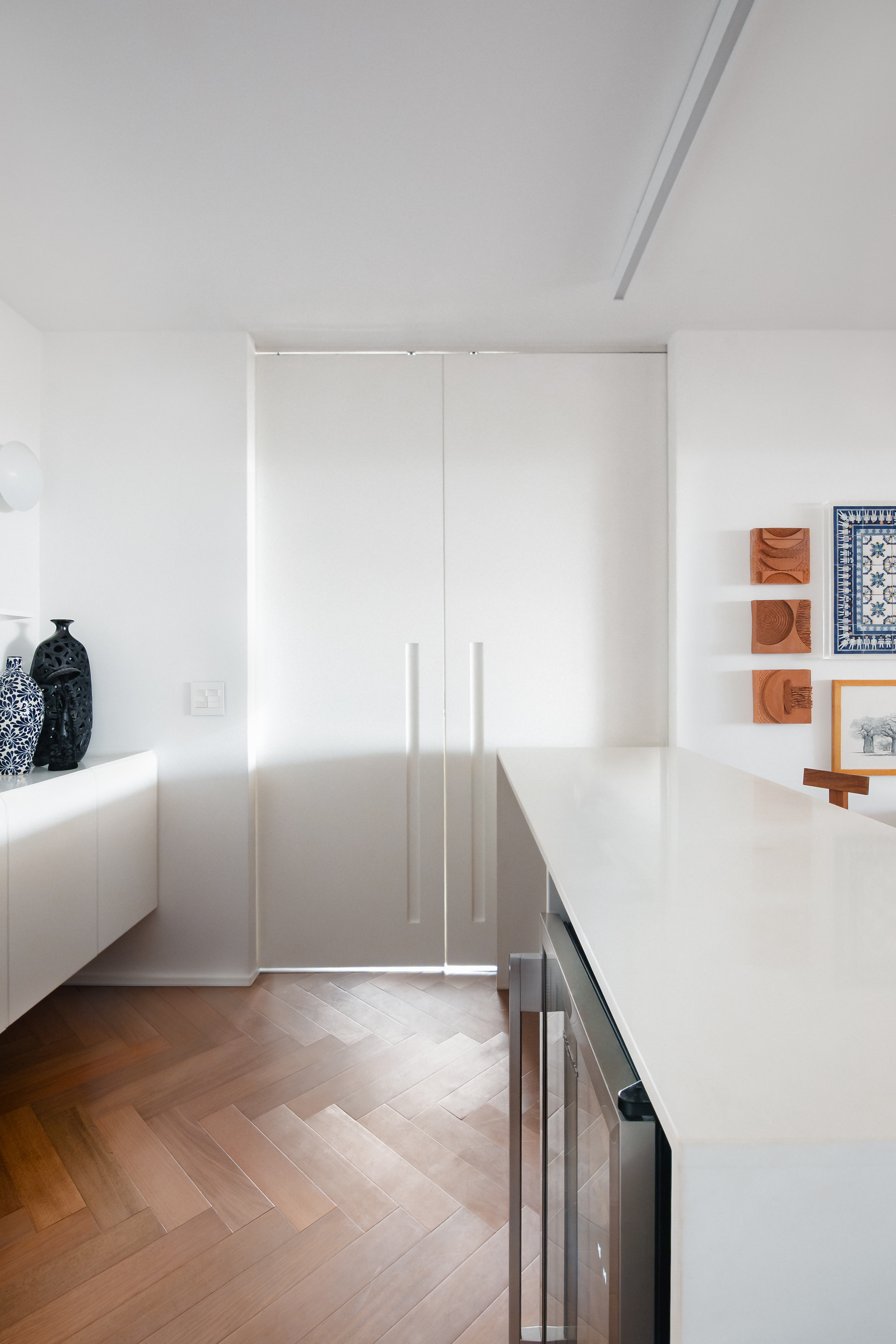 Outra necessidade da família era integrar a cozinha com a sala de jantar, mas de uma maneira que fosse possível também fazer o isolamento entre os dois ambientes. Criamos então uma bancada na cozinha que se estende até a sala de jantar, interrompida pela porta dupla que faz a integração e isolamento entre os dois ambientes.