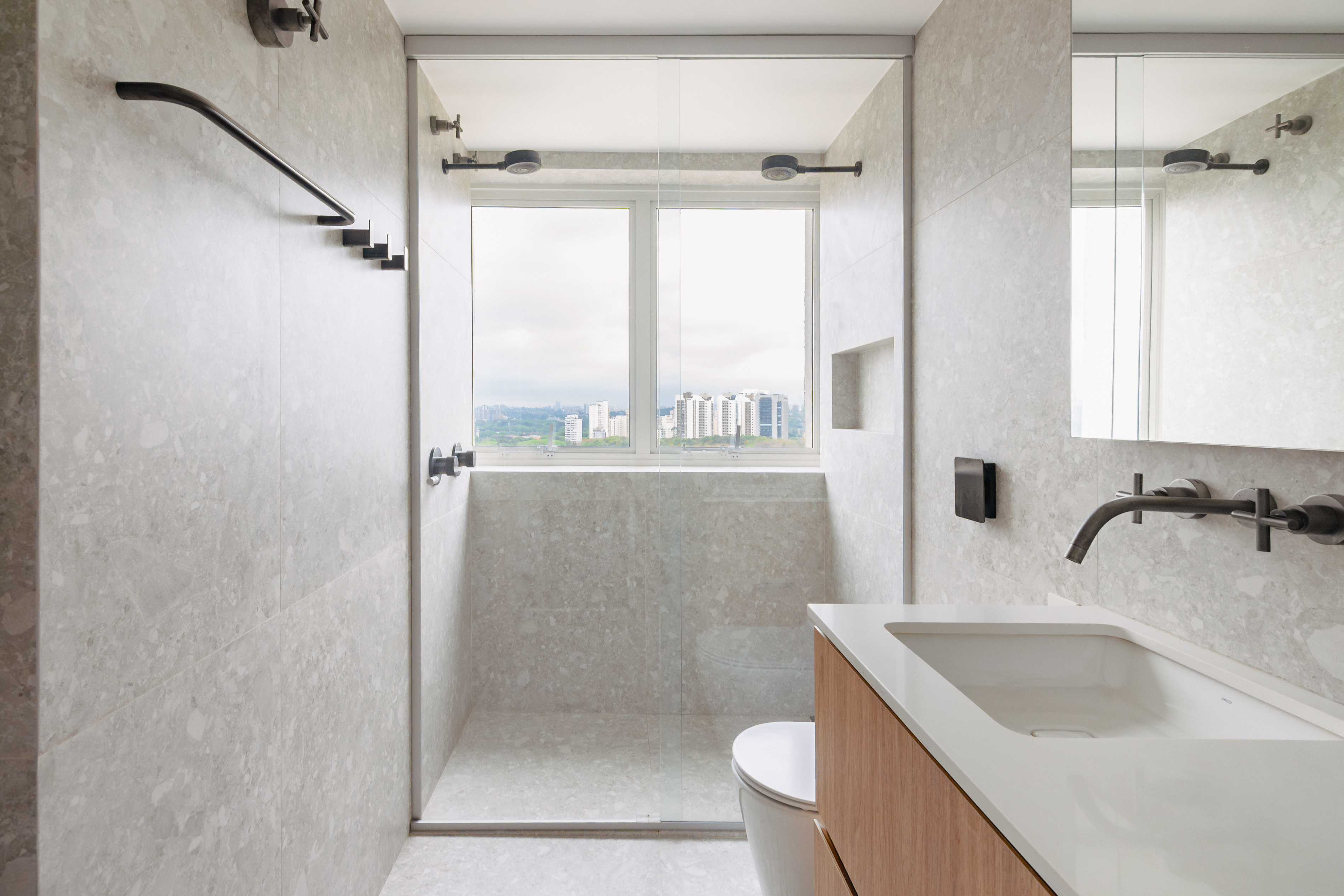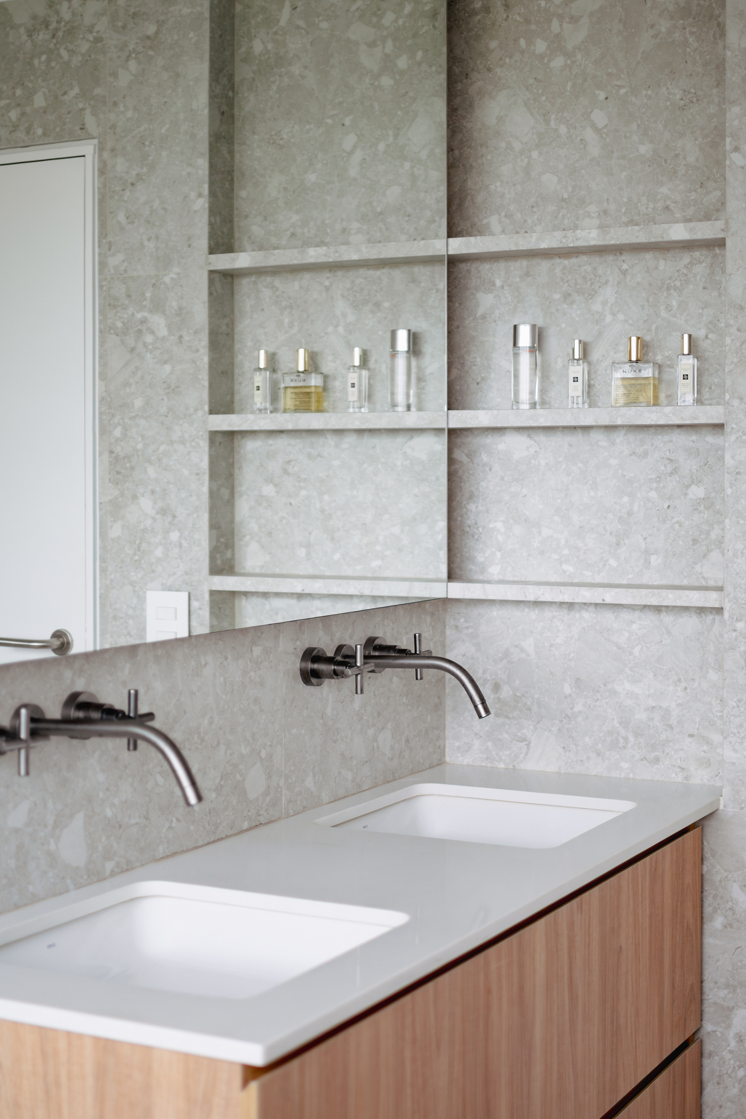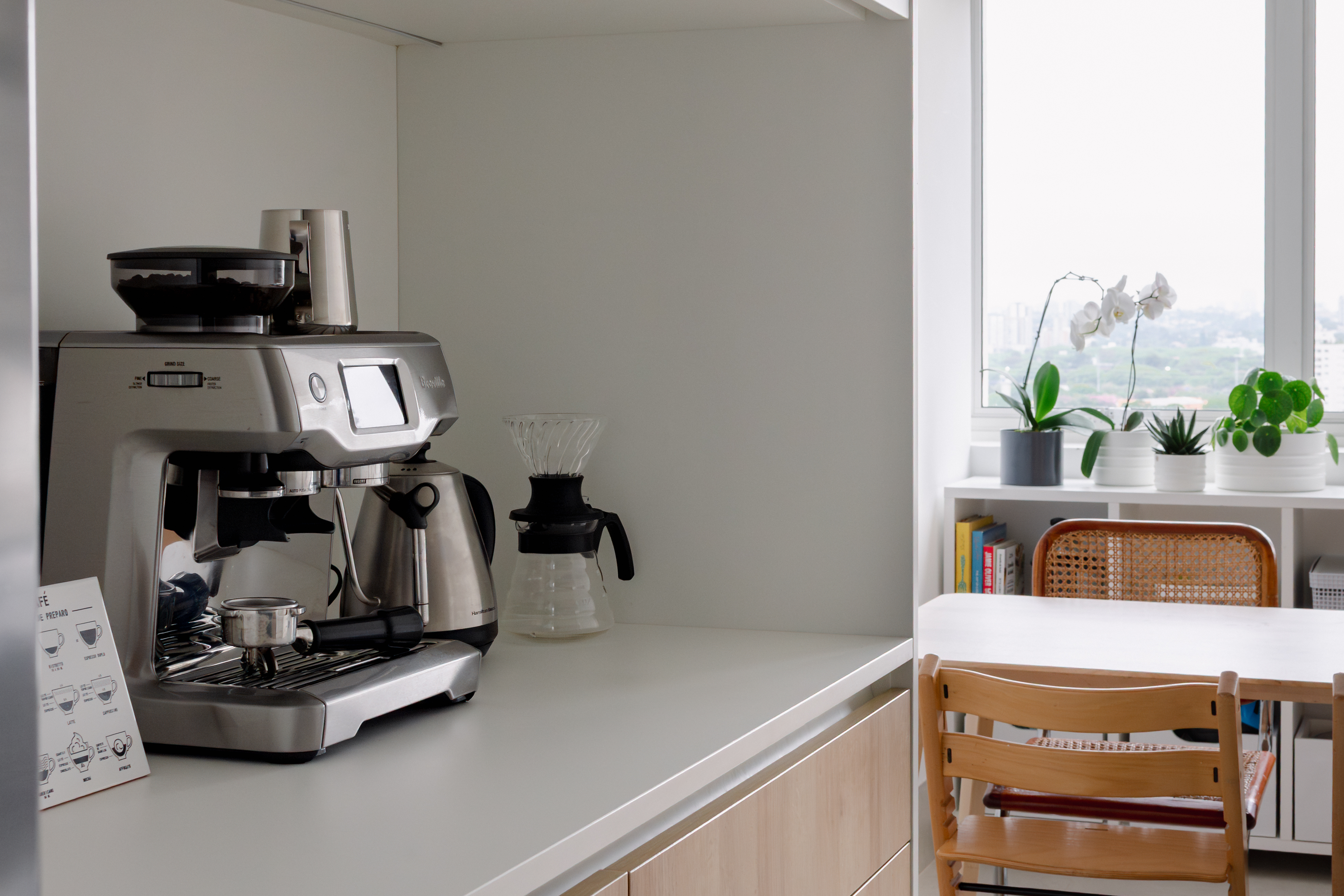 Outra necessidade da família era integrar a cozinha com a sala de jantar, mas de uma maneira que fosse possível também fazer o isolamento entre os dois ambientes. Criamos então uma bancada na cozinha que se estende até a sala de jantar, interrompida pela porta dupla que faz a integração e isolamento entre os dois ambientes.