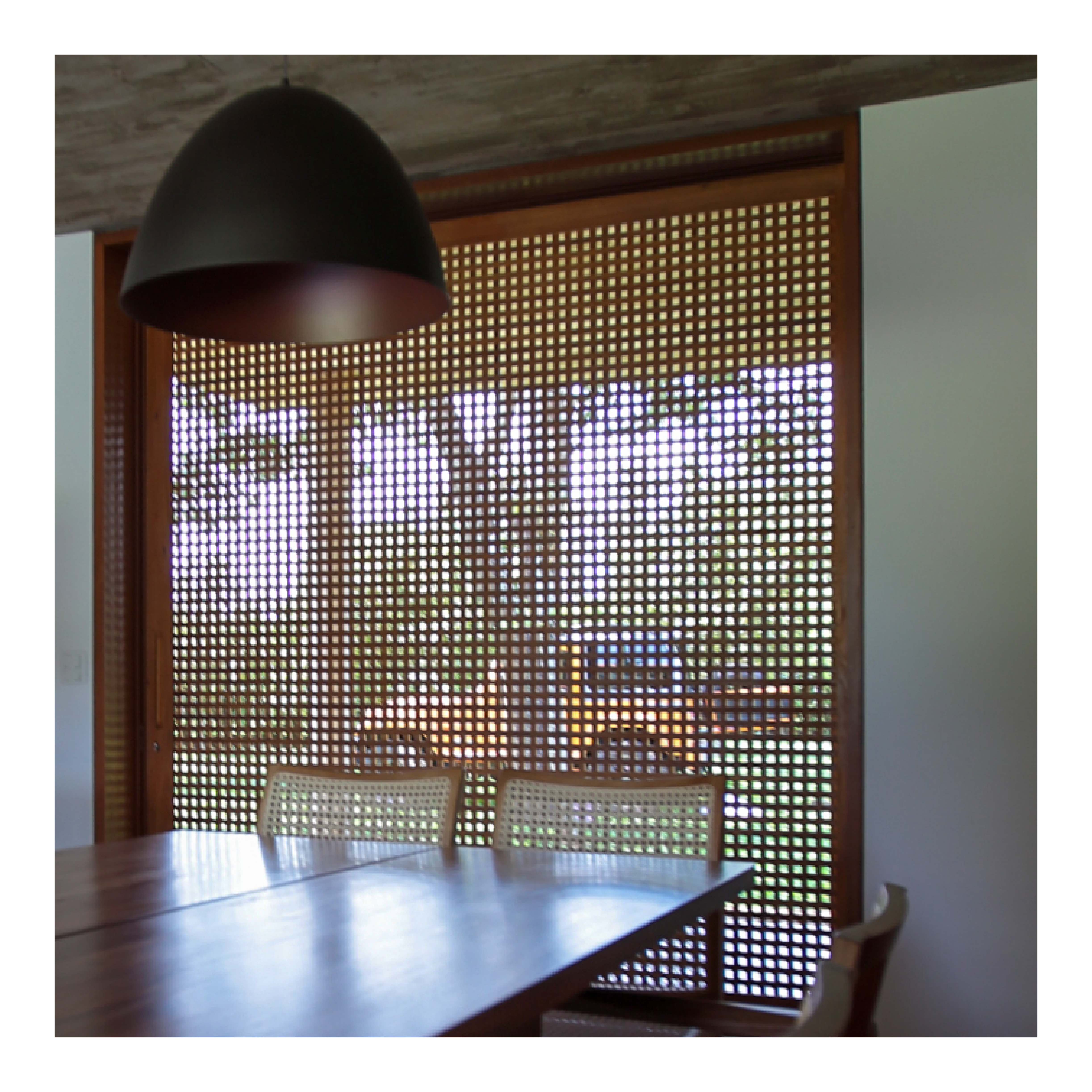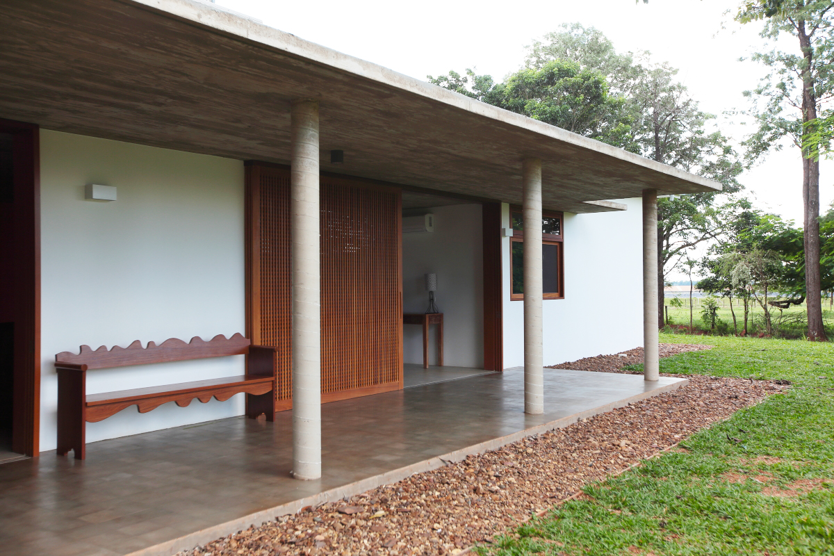 A nova reforma, projetada pelo nosso estúdio, visava reequilibrar essa relação, mantendo e modernizando as 4 suítes com janelas maiores, demolindo a parte antiga, que tinha problemas estruturais, e criando novas área social e de serviço, com uma integração melhor entre todos os ambientes. Essa ampliação foi feita perpendicularmente à área íntima, no sentido contrário às demais instalações da fazenda, criando uma área de lazer com mais privacidade. A laje de concreto armado, que se estende como marquise para as varandas, diferencia claramente a construção nova da antiga. Além da varanda em frente à casa, que dá acesso à sala de estar e jantar, foi criada uma varanda mais ampla, nos fundos, com saída pela sala de jantar, e cozinha, abrigando um balcão de concreto com churrasqueira. O piso, de ladrilho hidráulico cinza liso das varandas, se estende, nos fundos, para além da cobertura, criando uma área perfeita para brincar, tomar sol ou olhar as estrelas.
