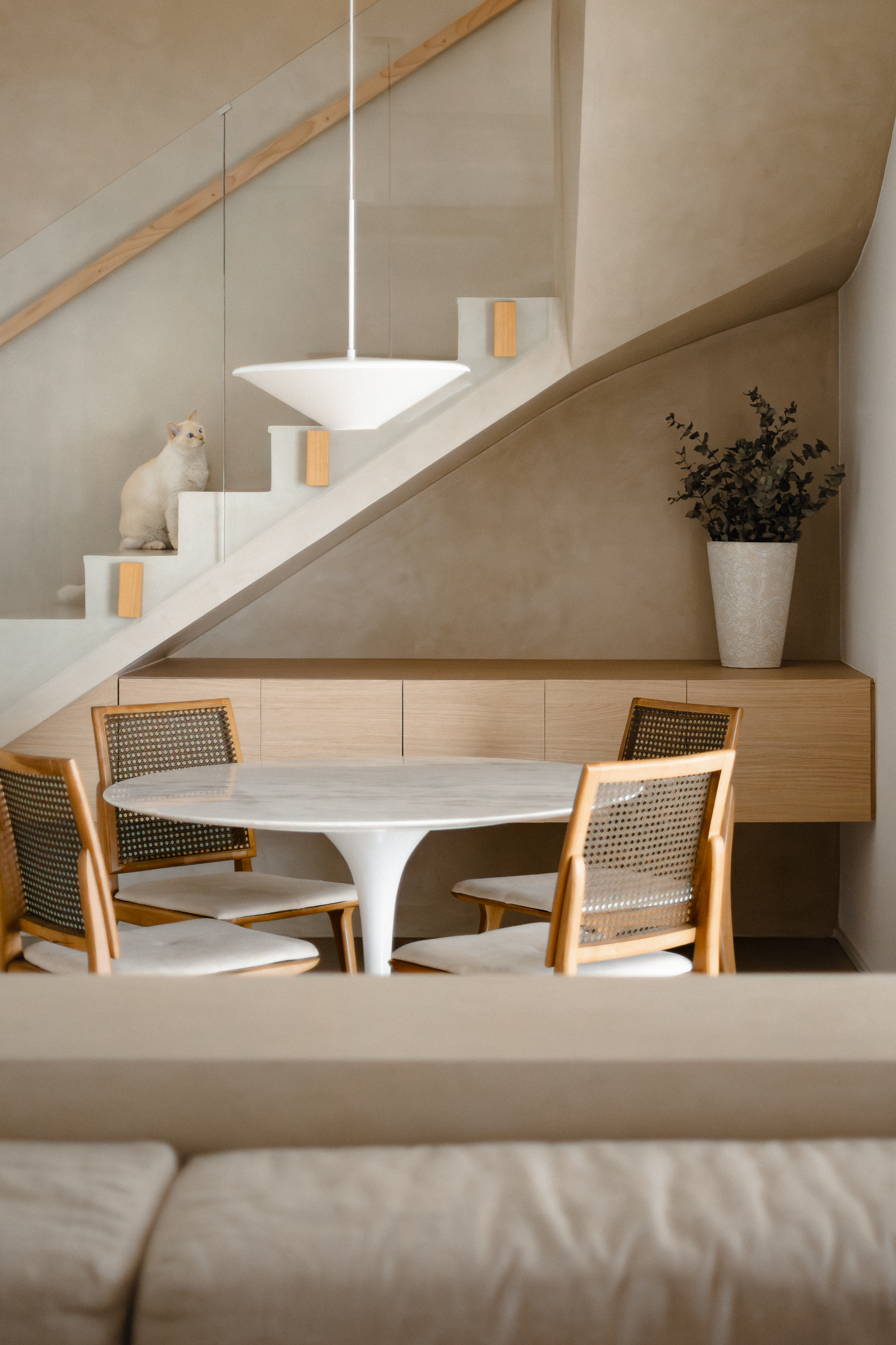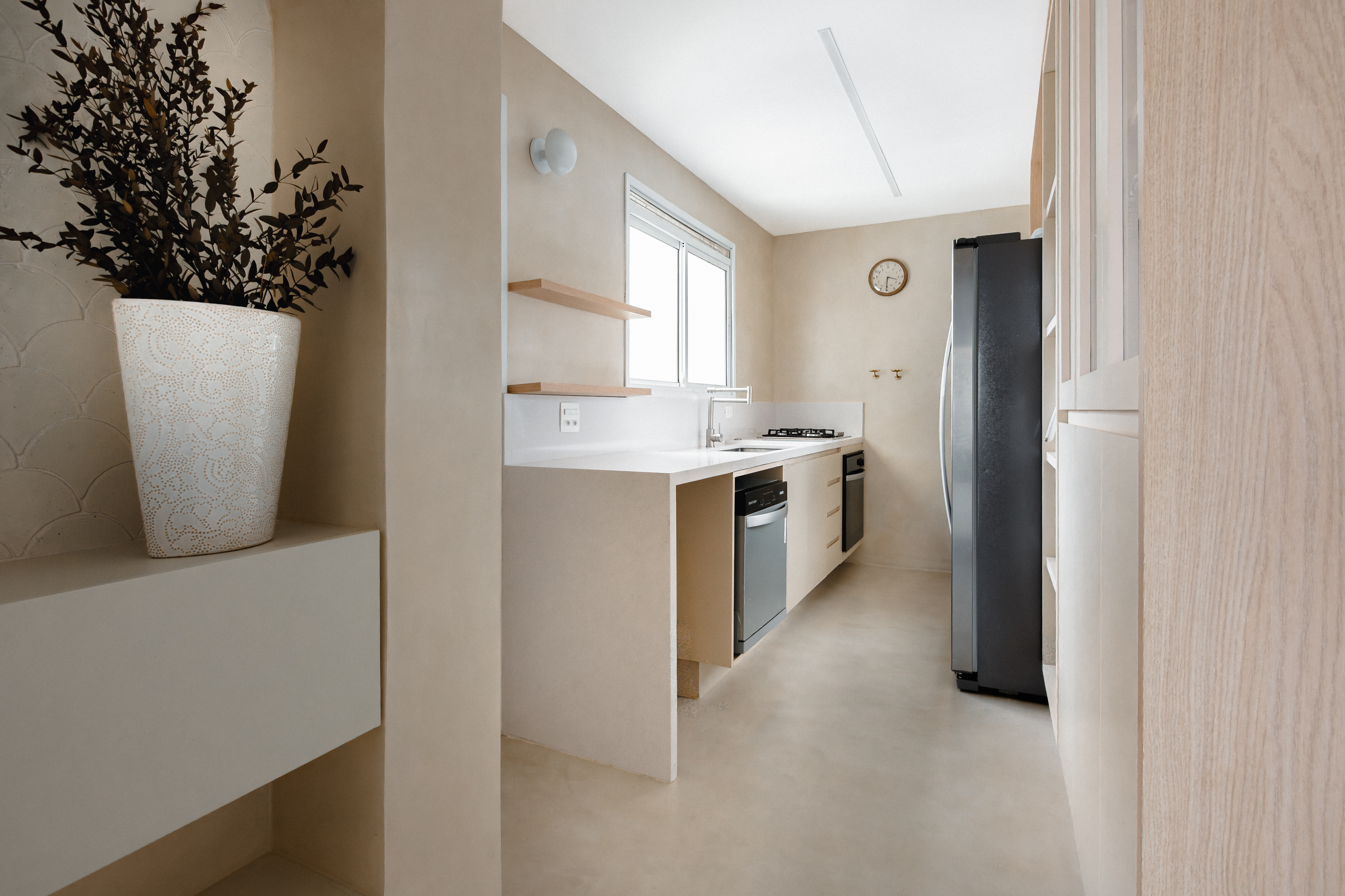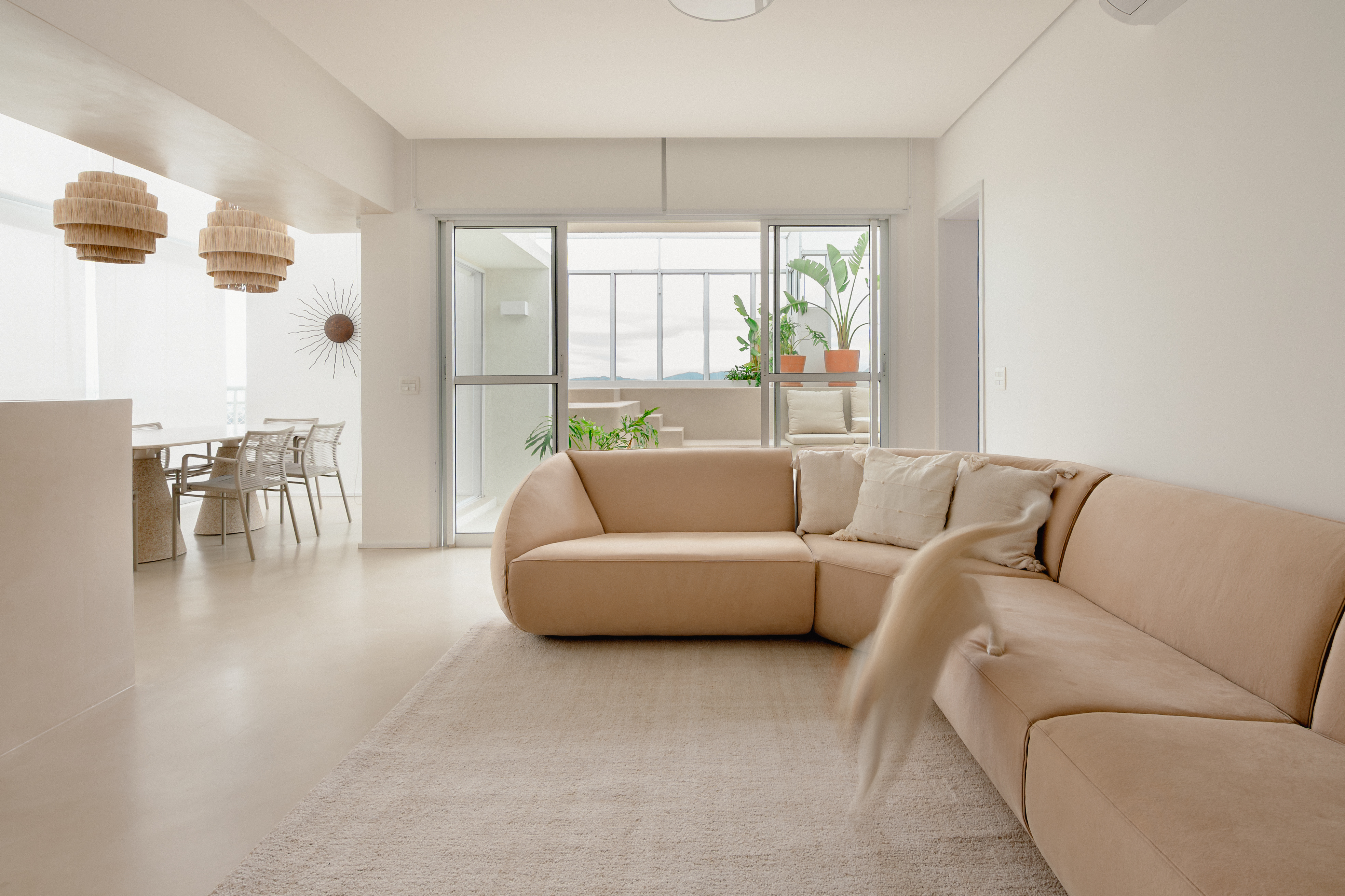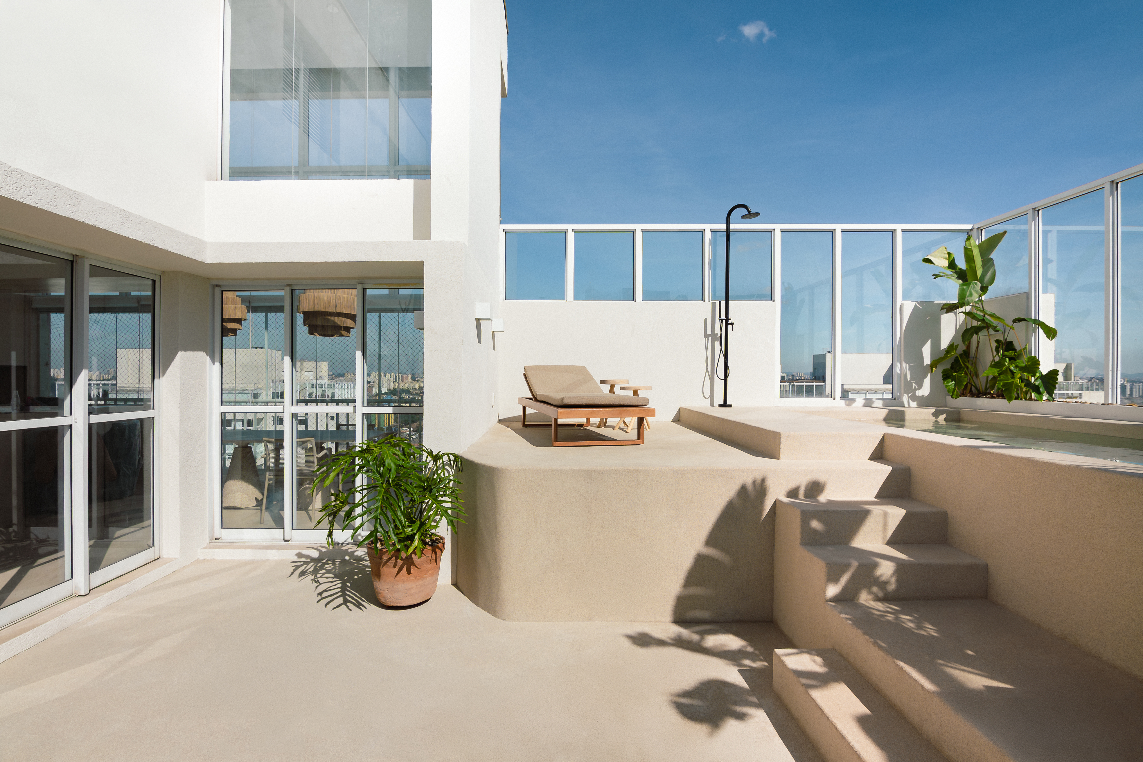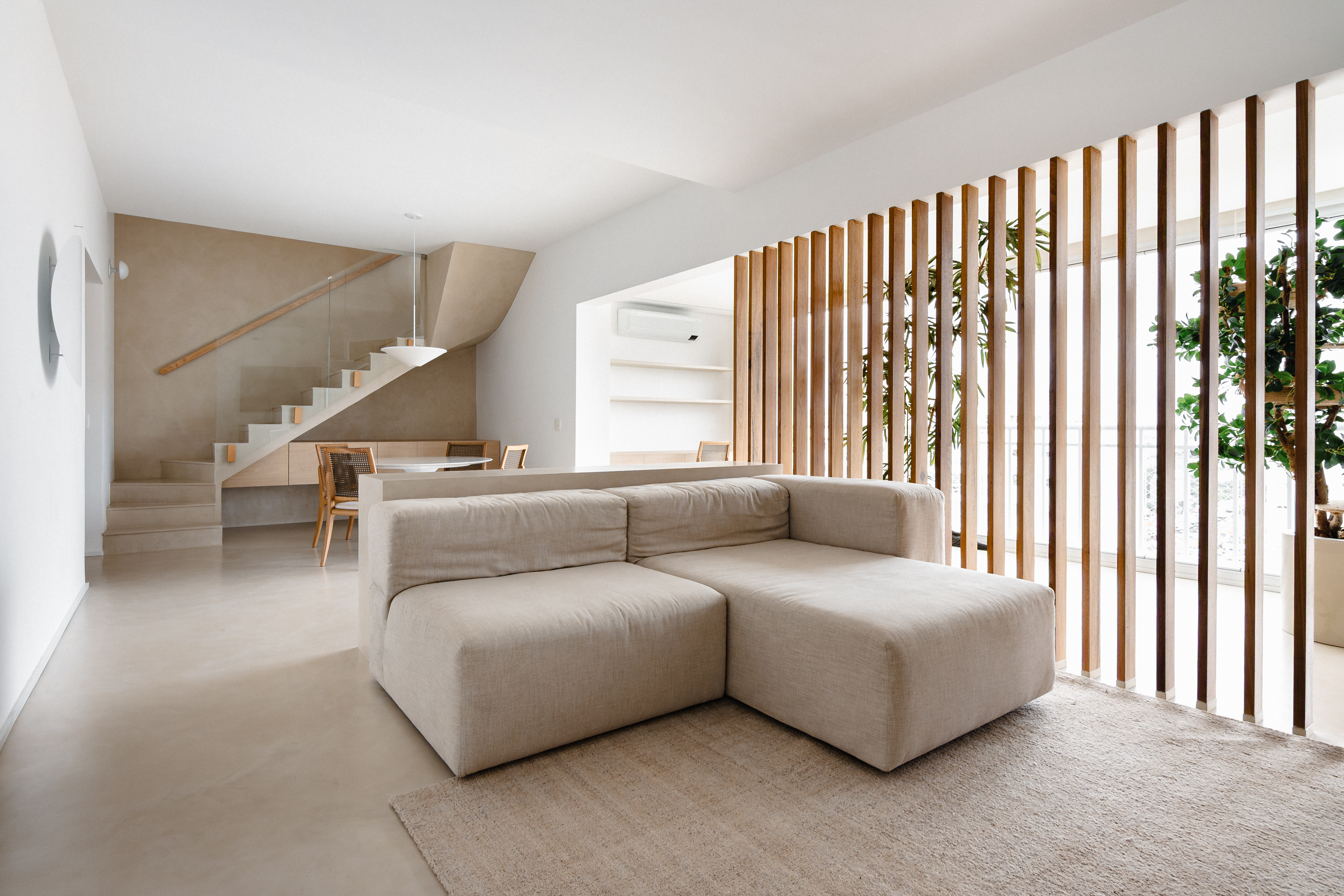 O desafio desse projeto foi criar, ambientes integrados numa planta bastante recortada de um apartamento duplex. Além disso, o desejo da cliente era criar uma atmosfera de casa de praia mediterrânea. A solução foi eliminar todas as barreiras possíveis da área social e usar revestimentos monolíticos, tanto na área interna quanto externa, que pudessem fazer as vezes de piso, parede e acabamento de alguns móveis fixos.