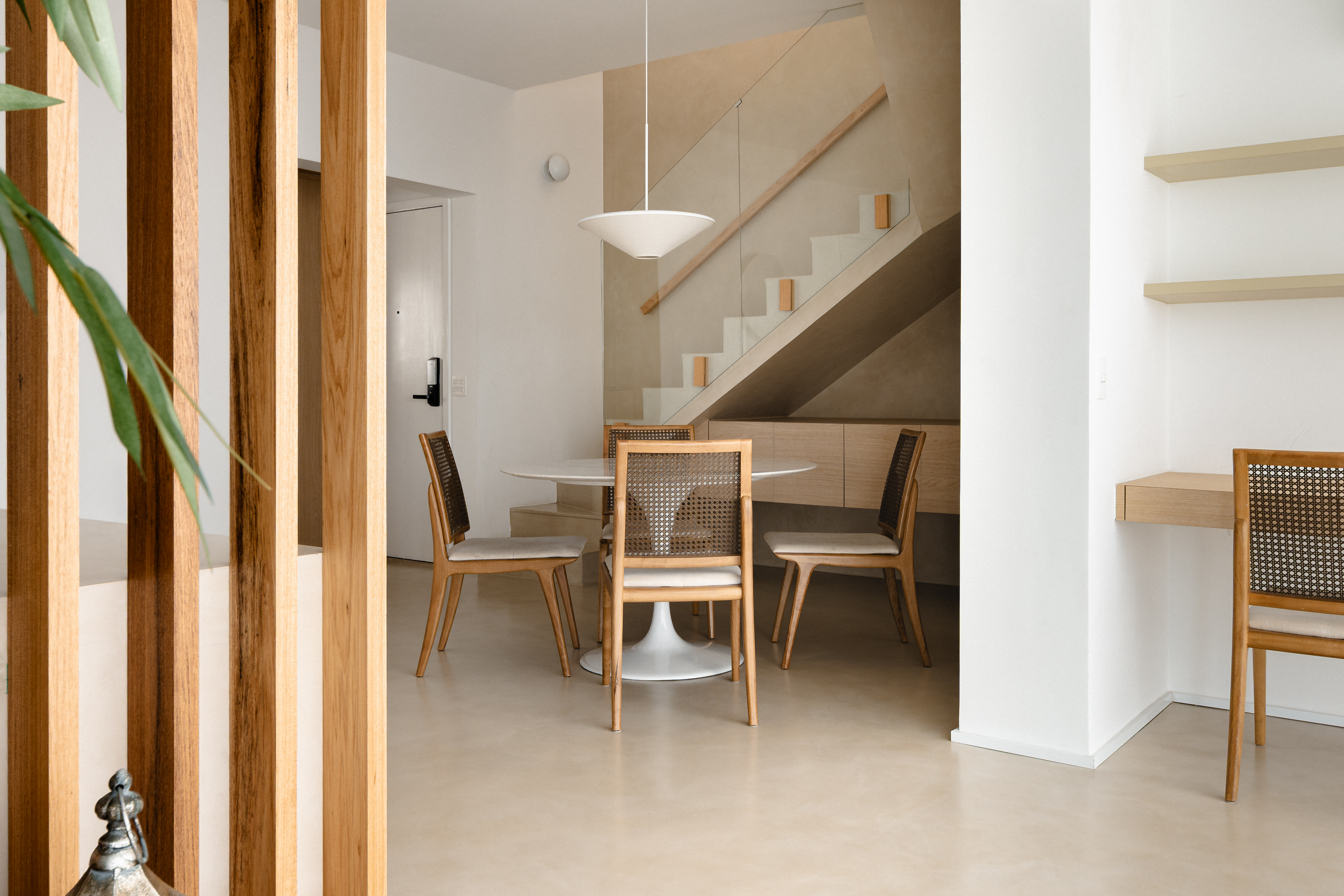 No piso de entrada, eliminamos as paredes entre cozinha, sala de jantar, sala de tv e varanda. Eliminamos também a parede que enclausurava a estreita escada para o piso superior. Os ambientes então foram separados de forma mais fluida. A nova sala de jantar, que agora tem um aparador embaixo da escada, é separada da sala de estar por uma aparador fixo. A sala de TV é protegida do sol com um brise ripado de madeira maciça que a separa da varanda, onde se encontra o escritório. Nesse piso, ainda criamos um pequeno hall de entrada, através de um nicho com um pequeno aparador.